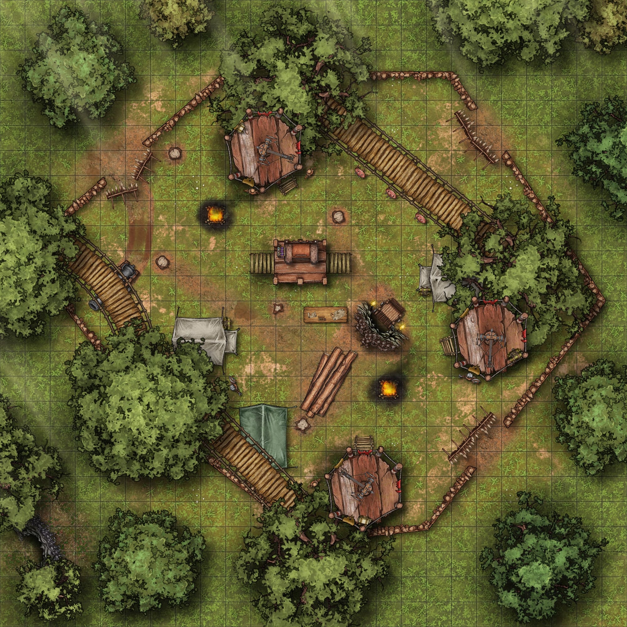 This map is ideal for encounters involving intrigue, infiltration, or combat in a forest setting. It could serve as a base for a rebel faction that the players are allied with or opposing, creating opportunities for negotiation, sabotage, or all-out battle. Its defensible design, with watchtowers and wooden barricades, makes it a dynamic setting for encounters where the environment plays a crucial role. Players could be tasked with defending the camp from an incoming attack or sneaking in to gather information or dismantle its operations.