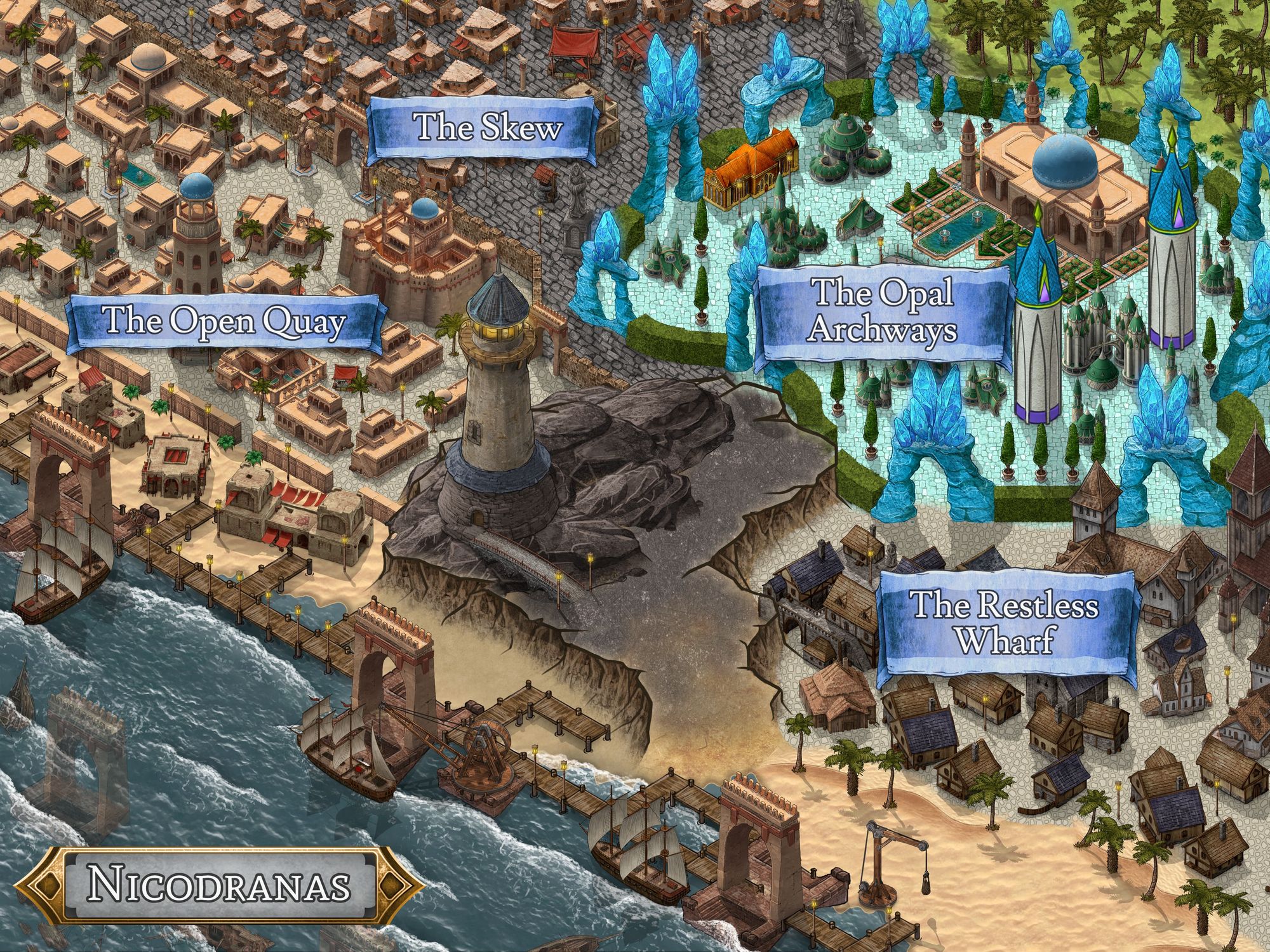 Centuries ago, the Opal Archways, a loop of eleven stone arches, marked the edges of Nicodranas before it expanded beyond its original boundaries. Today, the Archways are markers of the lively social center of the city, illuminated by multicolored torches and incense at dusk. The area is expensive, making it exclusive to nobles, wealthy merchants, and political figures. Foreign diplomats and moneylenders often own a part-time leisure home within the district.