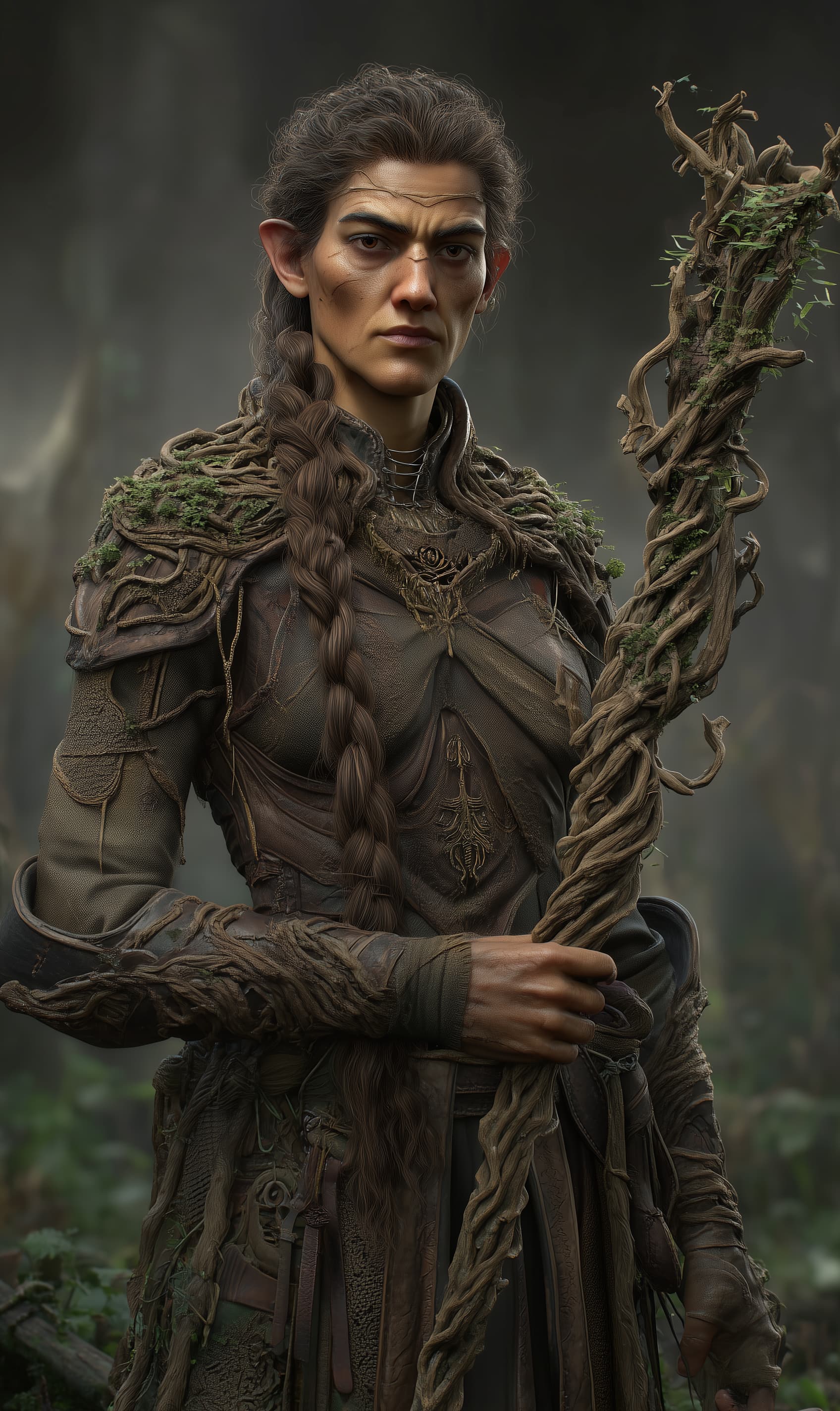 She wears layered leathers reinforced with bark plates and woven root-fiber cords. Moss and small charms hang from her cloak, each tied to a specific warning or ward. Her eyes are steady and penetrating, often fixed not on faces but on feet, waterlines, and the subtle shifts of ground beneath them. A gnarled root-staff—still faintly alive—rests constantly in her grip.