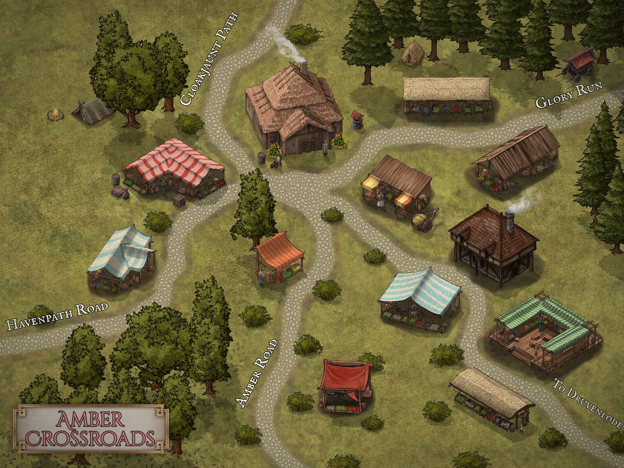 The Amber Crossroads is a bustling hub of activity where four major roads converge. The Amber Road and the Havenpath Road merge with the Cloakjaunt Path and the Glory Run road to create a sprawling crossroads that serves as a vital link between the region's major cities. This central location makes it a popular destination for travelers from all over, with the town itself serving as a waypoint for merchants, mercenaries, and adventurers alike.