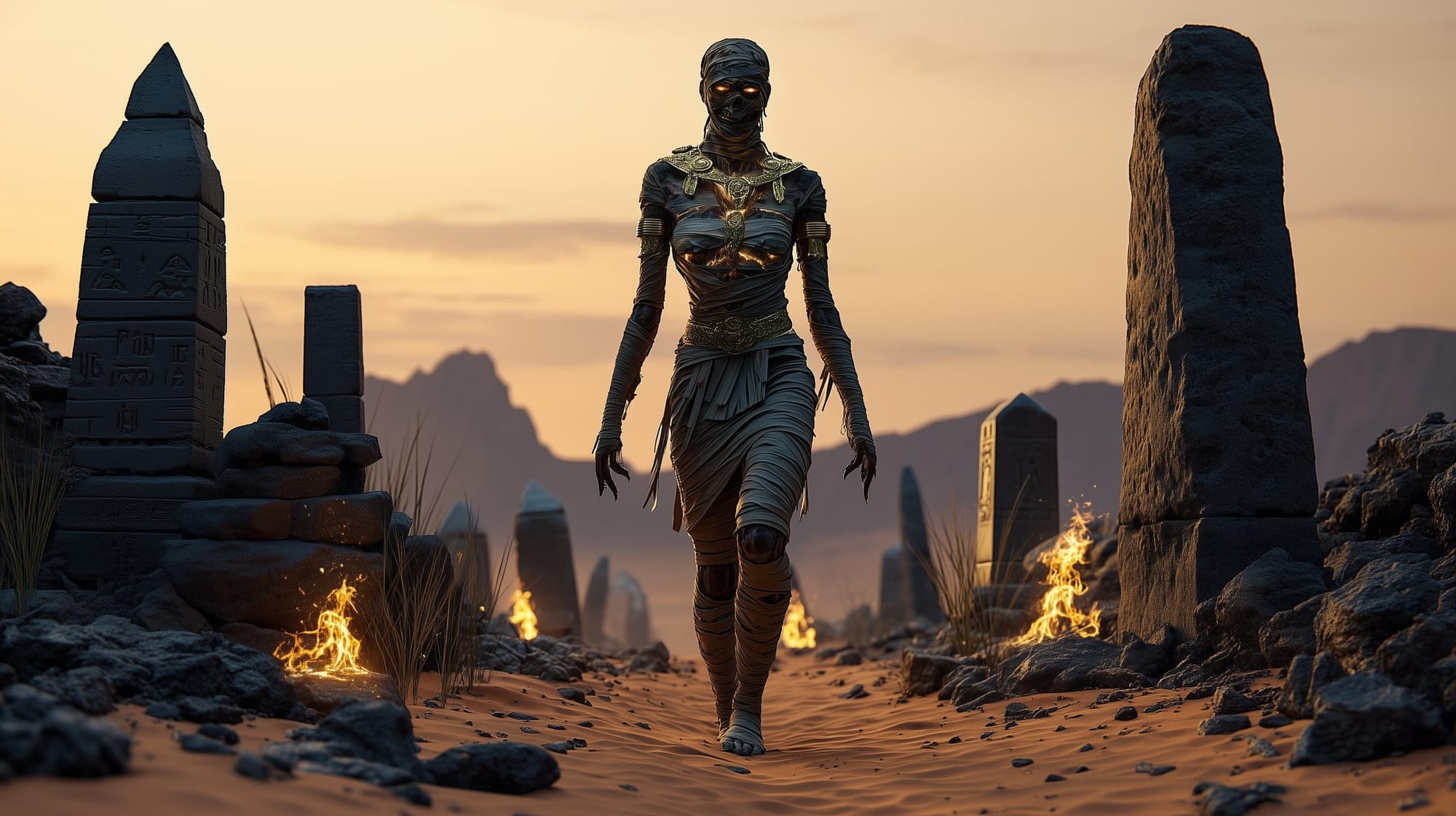 Amu-Rekhet is regal and terrifying, her desiccated form draped in ceremonial linen stitched with prophecy glyphs, her wrappings soaked with ancient myrrh and cursed ink. Her face is obscured by a cracked golden funerary mask, beneath which faint light flickers through empty sockets.