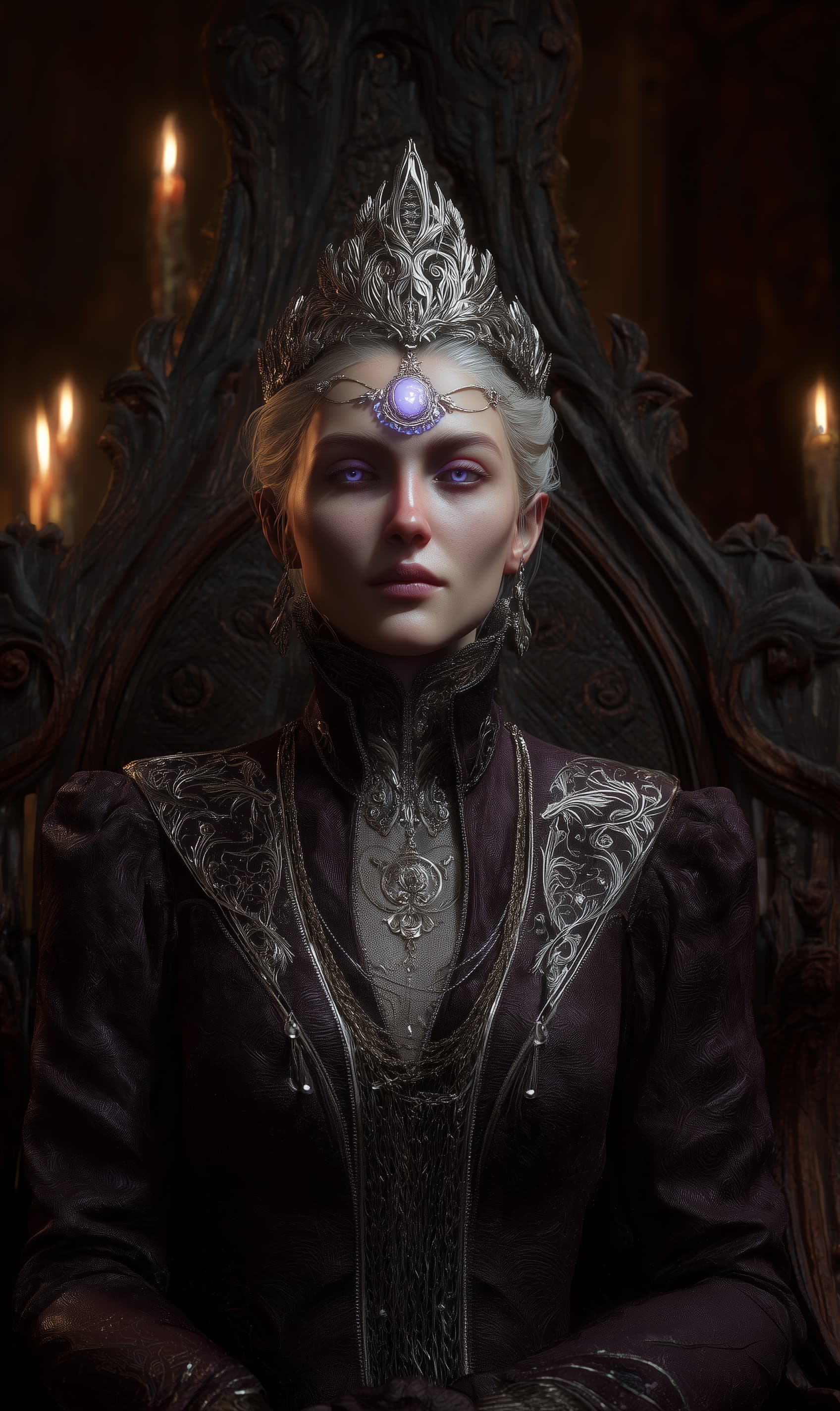 Appearance: Lysenna is the embodiment of beauty and brutality: refined, poised, and utterly unreadable. She wears rich, high-necked gowns of embroidered velvet and satin, typically in cool greys, purples, or midnight blue. Her platinum-blonde hair is always styled to perfection, framing sharp cheekbones and calculating lavender eyes. A silver circlet rests upon her brow, inlaid with a single sapphire that pulses faintly when lies are spoken nearby. Her voice is calm, musical, and never hurried.