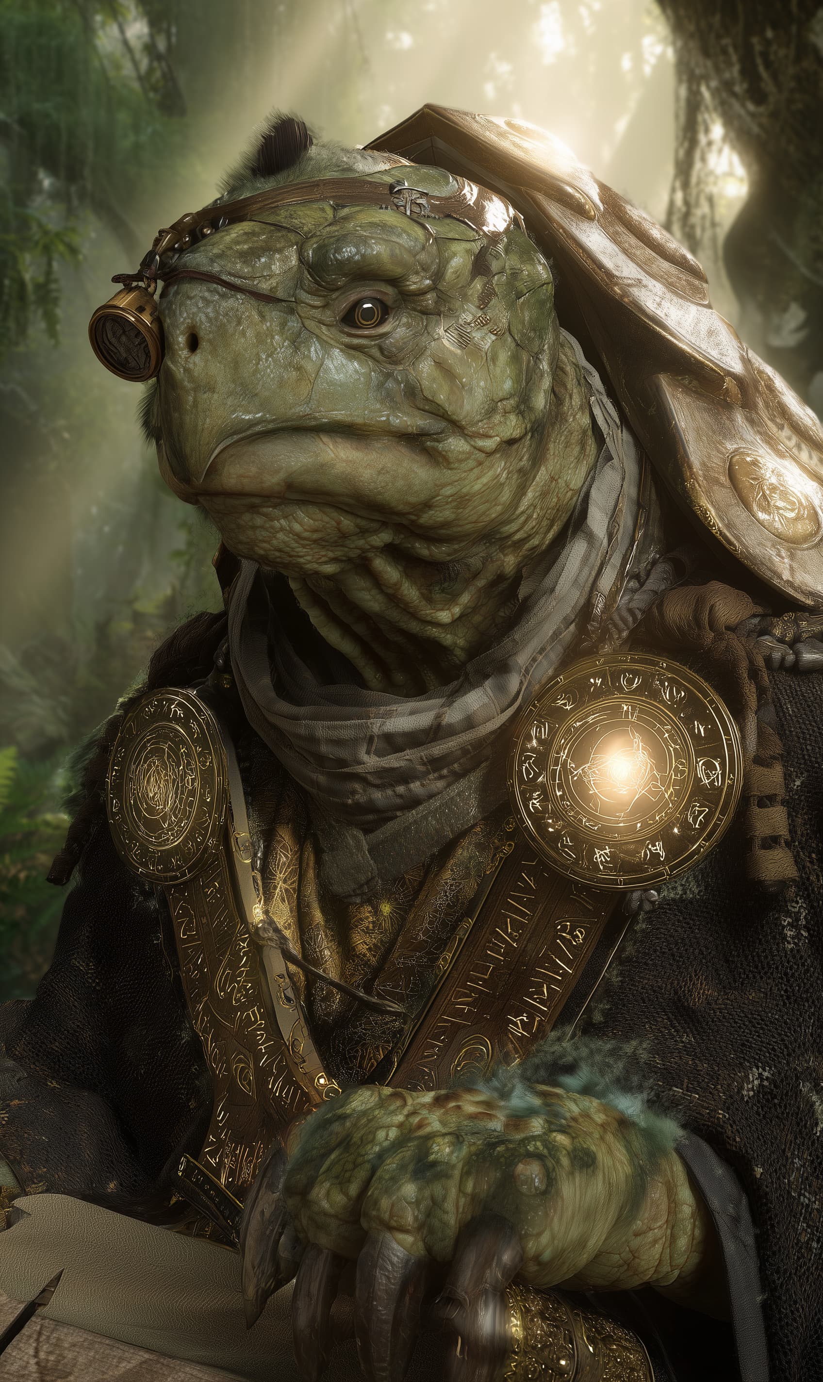 Appearance: Nollik is a large, weathered tortle with a domed shell covered in chalk runes, etched prayers, and cracked ritual seals. His skin is a deep mud-green with ivory-hued plates, and his eyelids blink horizontally when deep in thought. He wears no traditional robes — instead, straps, scroll loops, and satchels are affixed to his shell. A gilded monocle hangs from a brass chain over one eye, and a delicate arcane astrolabe is embedded into his plastron just above the sternum, softly glowing with drifting constellations.