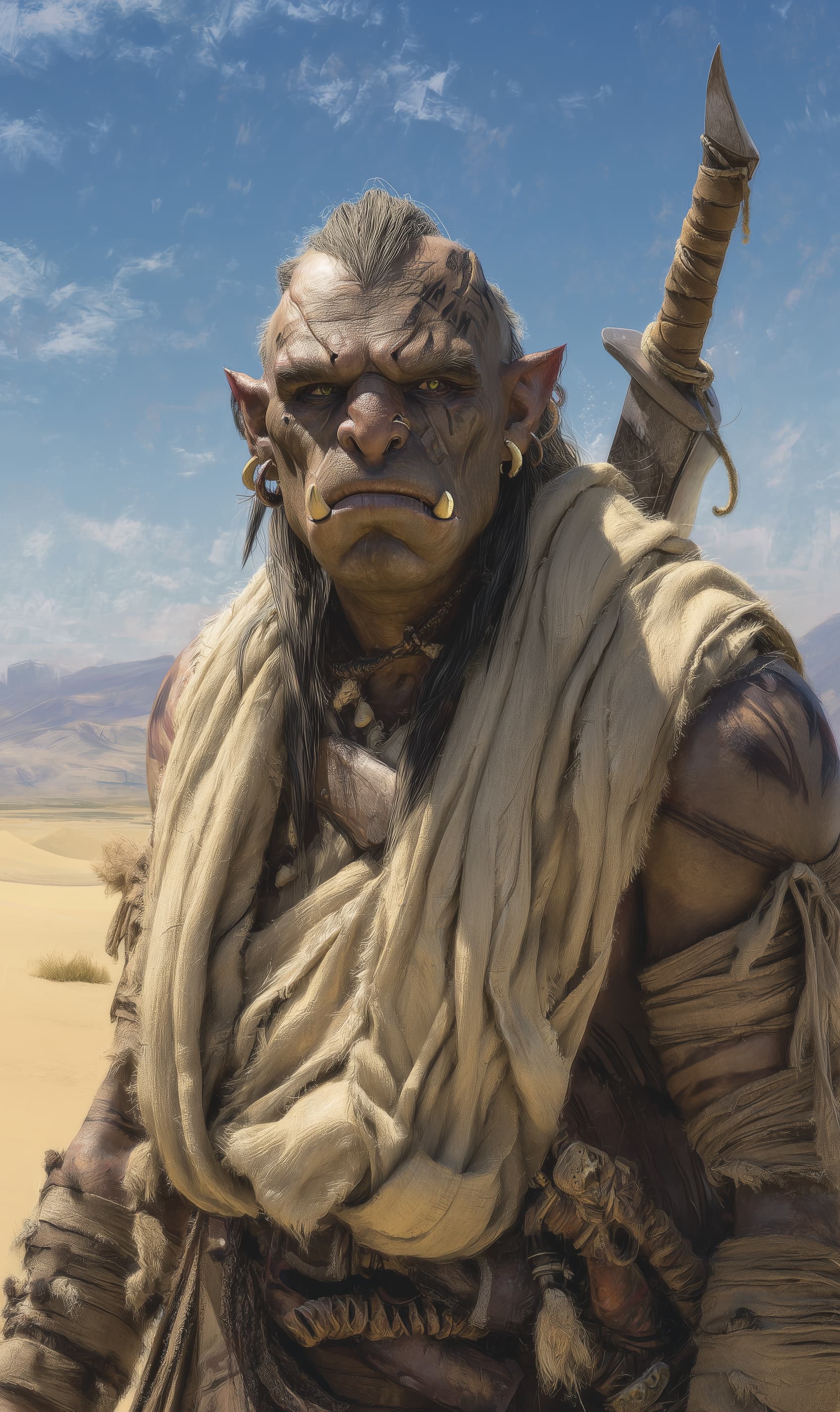 Appearance: Arrekk is broad-shouldered and wiry, sun-darkened and dust-caked. His bare feet are cracked and calloused, his legs wrapped in linen against desert scalds. Once proud tusks are chipped, and ritual scars form spiraling brands across his arms and back — some self-inflicted, others not. He wears no armor, only a sun-bleached mantle and a wooden prayer necklace carved with orcish script. A curved greatsword, wrapped in cloth and peace-binding cord, hangs across his back — unused, but not forgotten.