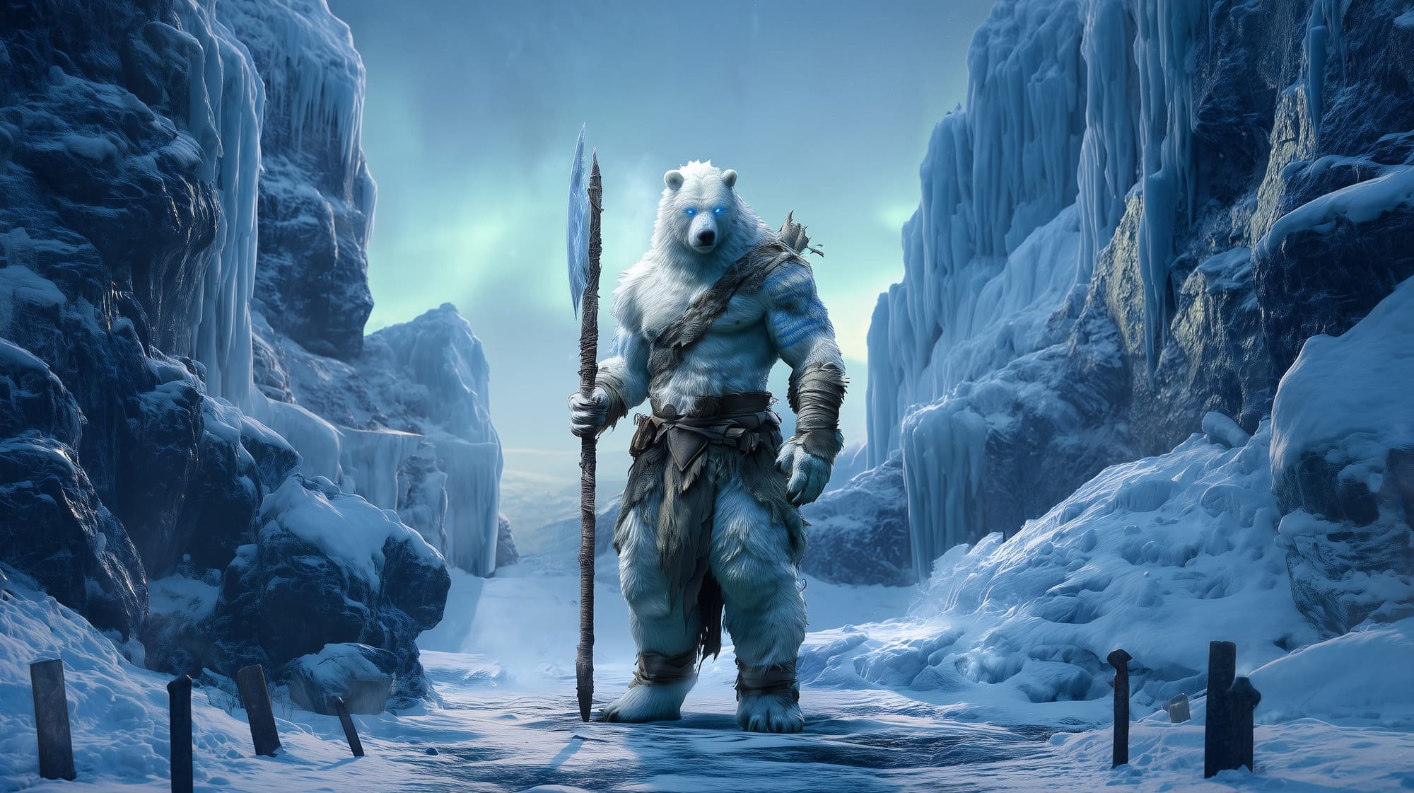 - Hybrid: A towering, white-furred brute (nearly 9 feet tall) with runic scarification across the shoulders, a cedar-wrapped greataxe haft gripped in one clawed hand. Breath plumes in steady drafts, never ragged.