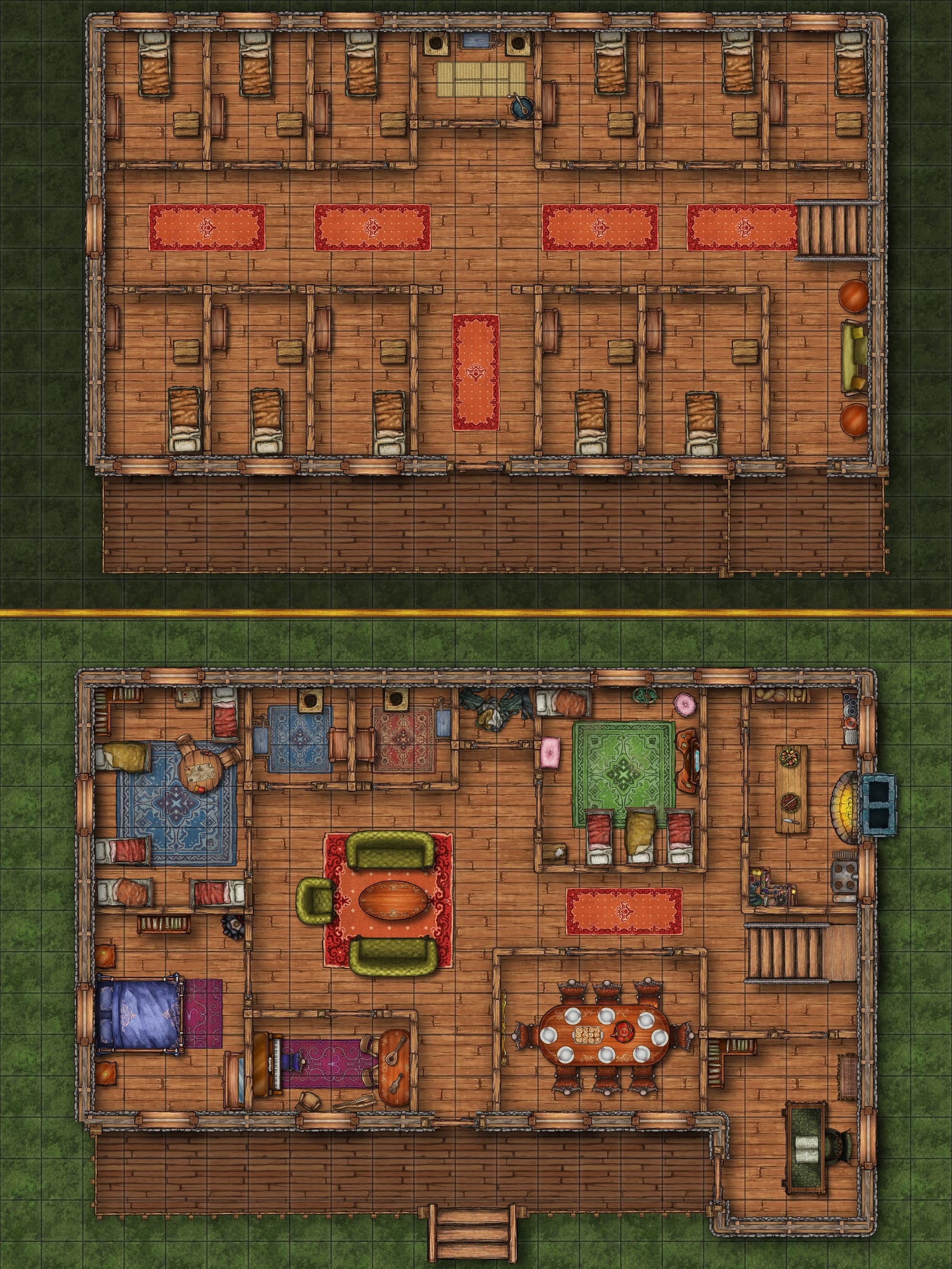In more tense scenarios, the map transitions seamlessly into a battleground for heightened encounters. The Boarding House might be the site of a rescue mission, with adventurers racing to free boarders or children held hostage in their rooms. Alternatively, it could be the stage for a defensive stand, as the players protect the house against bandits, kidnappers, or dark forces targeting its residents. The layout, with its narrow halls and multiple access points, lends itself to strategic combat or stealthy maneuvers during such conflicts. The juxtaposition of cozy, domestic spaces with potential danger adds tension and stakes to any encounter.