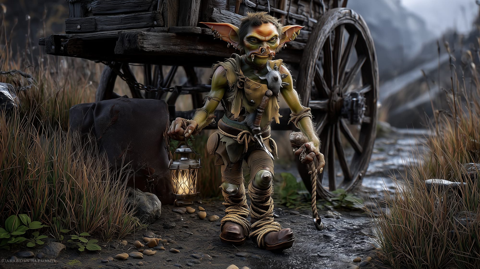 Bootsneak is thin-limbed, wiry, and twitchy, with greenish skin mottled by old bruises and scrapes. His ears are big and jagged along the edges like they’ve been chewed by bad luck. One eye is a little cloudy from an old poke, giving him a permanent squint that looks like suspicion (and usually is). He wears a patchwork vest made from cut-down sleeves and stolen buttons, and his prized possession is an oversized pair of human boots cinched tight with rope—so big they flap when he runs. He smells faintly of smoke, damp leather, and something sharp like cheap spirits.