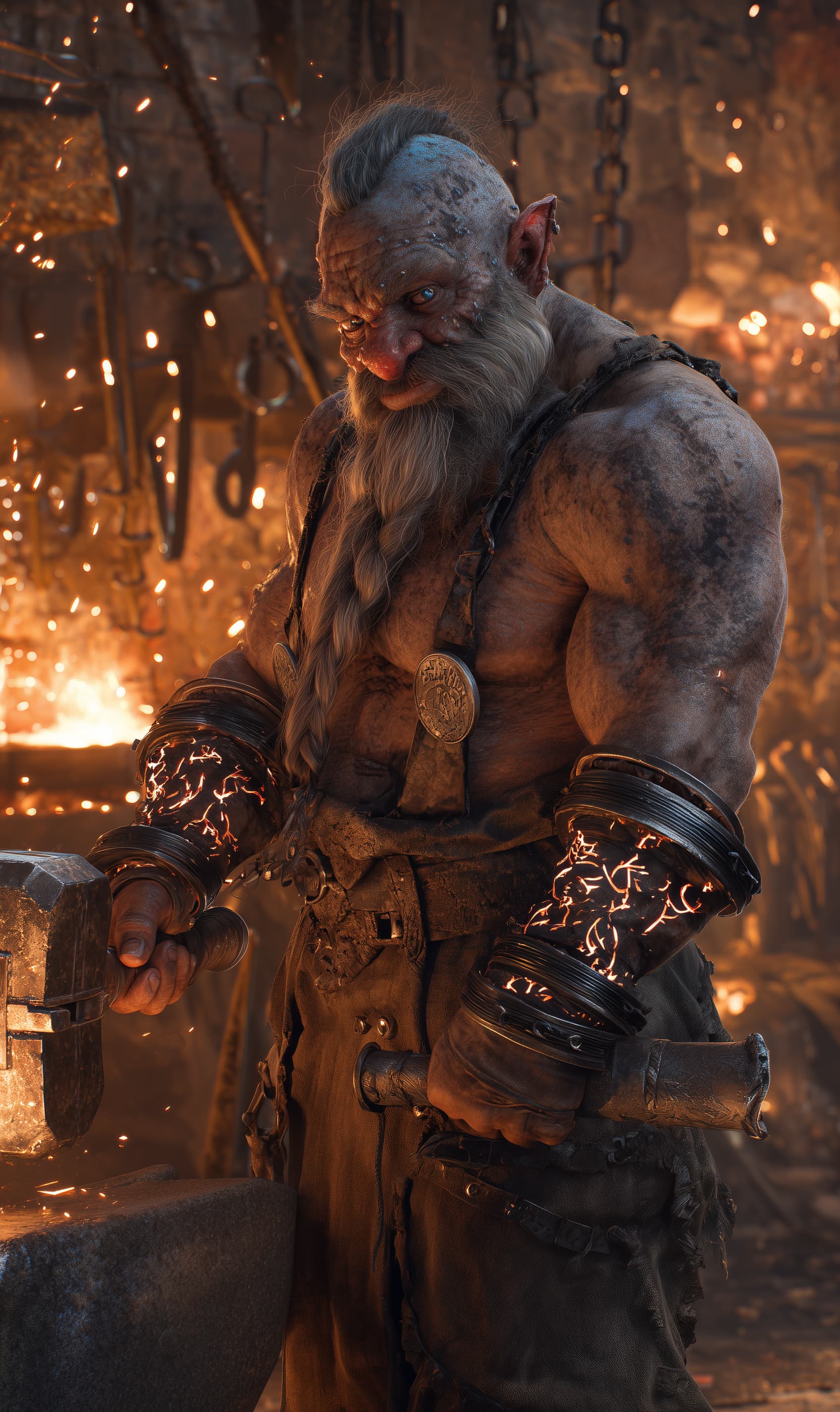 Appearance: Brast is squat and sturdy, his flame-scorched beard tied with copper rings and glowing embers. He wears soot-flecked leather overalls with utility pockets filled with small ores, vials, and spark catalysts. His arms are clothed in metal bracers etched with explosive runes. His workshop belt holds tongs, chisels, and a blowtorch-like burner made from a skyshard fragment. His face is perpetually smudged with ash, and his eyes gleam with both warmth and the promise of controlled chaos.