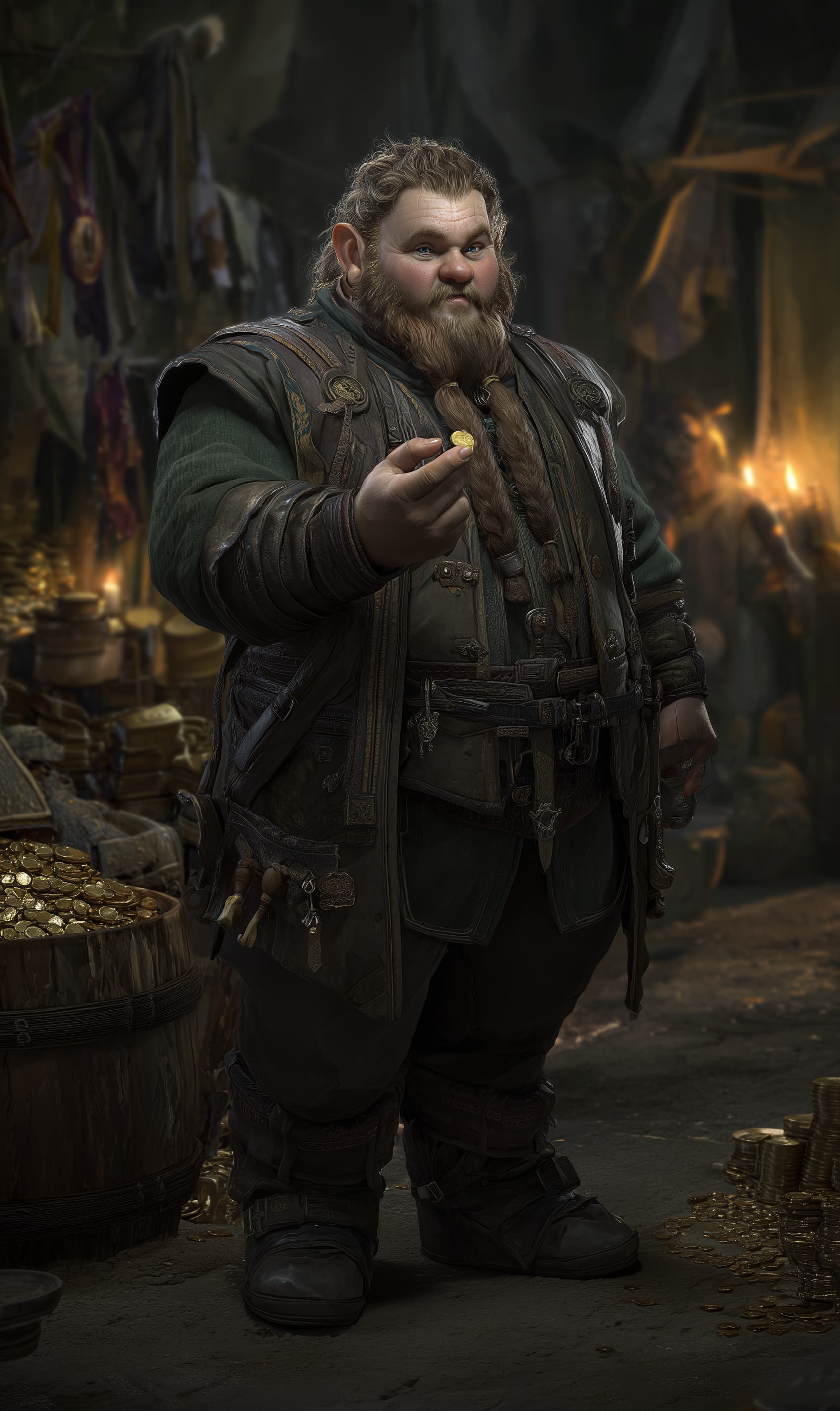 Appearance: Brennan Oakheel is a broad-shouldered dwarf in his mid-hundreds, compact and immovable-looking in the way of a well-set cornerstone. His rust-brown beard is kept shorter than dwarven tradition typically favors β practical for a man who spends more time leaning over ledgers than honoring clan rites β clipped to a blunt wedge and shot through with early grey at the edges. His eyes are a warm amber that sharpens to something considerably less warm when numbers don't reconcile. He dresses well but plainly: heavy wool in deep green, a leather-bound counting vest with interior pockets organized by denomination, and boots that have never seen mud if he can help it. A coin of unusual make β large, thick, bearing a stamp no one has identified to his satisfaction β rides in his left waistcoat pocket and turns up between his fingers whenever he's thinking.