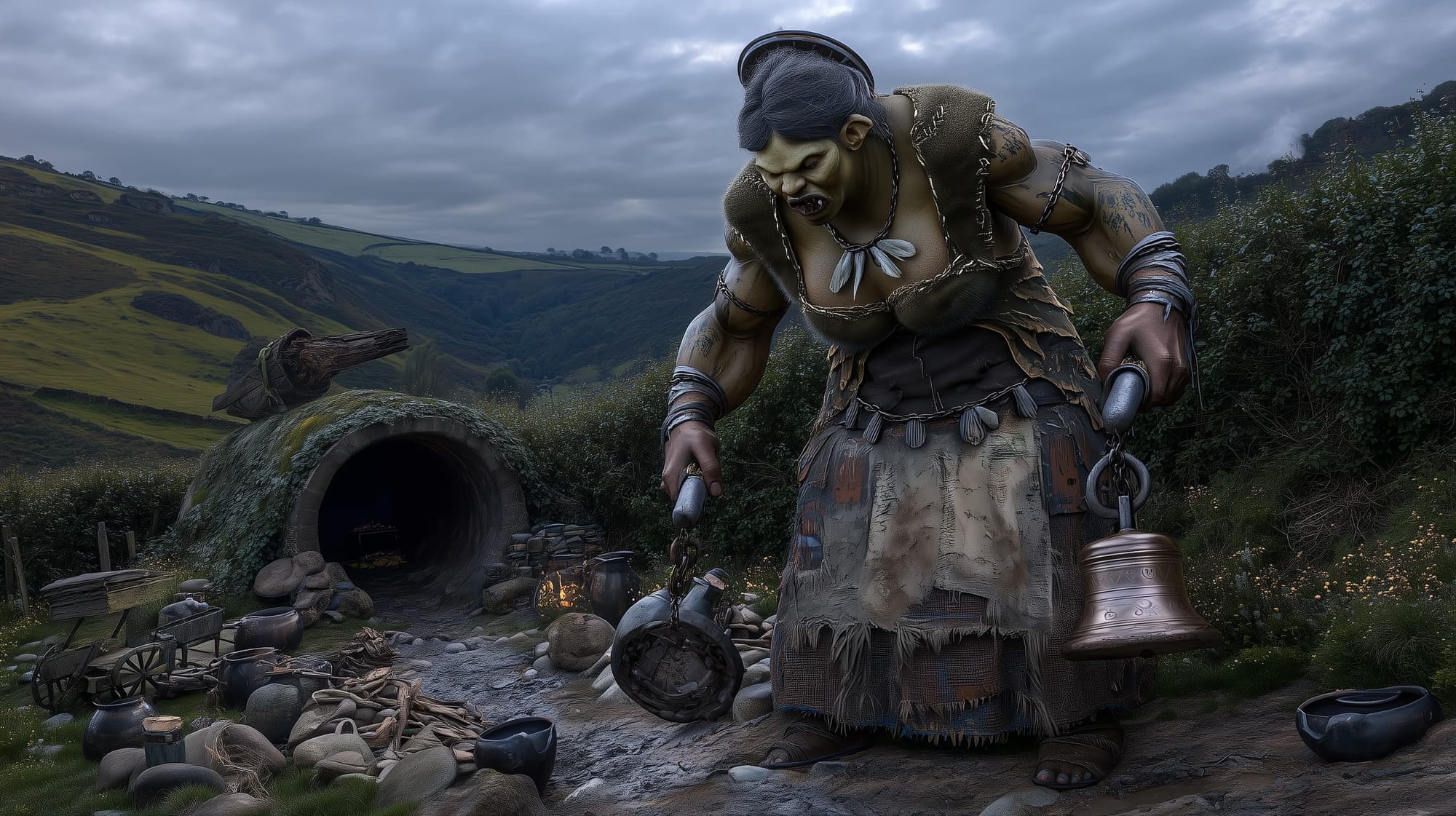 Brugga is tall even for an ogre—broad-shouldered, long-limbed, and swollen with uneven, unhealthy bulk. Her skin is sallow and blotched, stretched taut across thick muscle and lumpy fat. A pitted iron cookpot sits on her head like a crude helm, strapped in place with rope and leather; the rim is dented as if it’s taken arrows and still laughs about it. She wears a patchwork apron stitched from sackcloth and old hide, stained with grease and dark smears that never quite wash out. One ear is torn almost in half, and her small eyes glitter with a hungry patience that feels wrong on something so large.