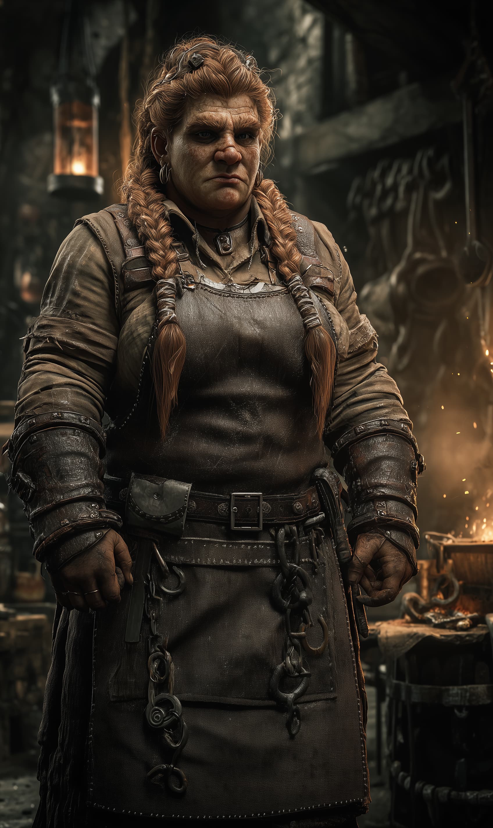 Her hair is a thick auburn braid bound tight with copper wire, and her beard is kept short, braided into two stubby cords capped with blackened iron rings. She wears chain beneath a heavy leather apron, layered with heat-scorched gloves, and a cloak that smells faintly of smoke and salt wind. At her belt hang tongs, a punch set, and a small chalk stone used to mark cracks in metal and stone.