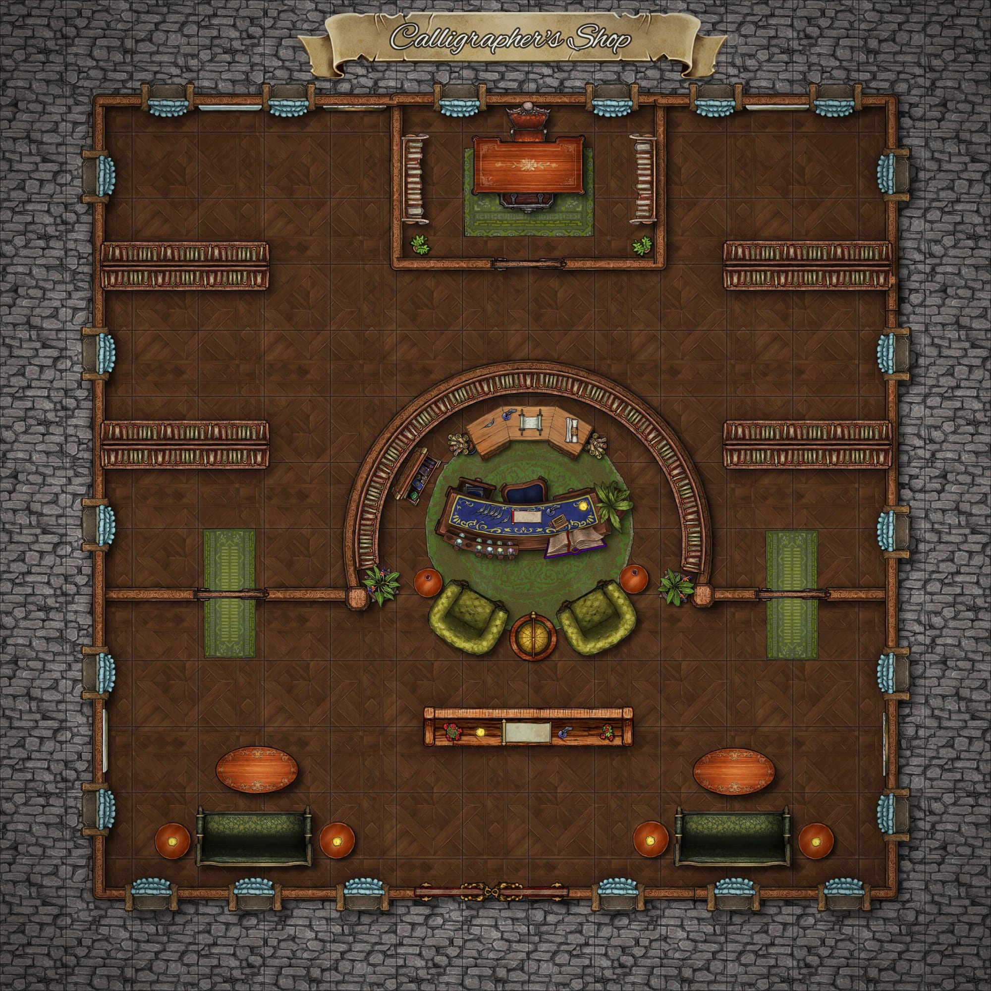 This map works beautifully for scenes of intrigue, investigation, or negotiation. Whether the party seeks an ancient map, a forged royal seal, or a letter of introduction, The Silent Line offers a roleplay-rich environment steeped in quiet tension. Every item on the shelves could hide vital information, and every visitor could be here for reasons more complex than they claim.