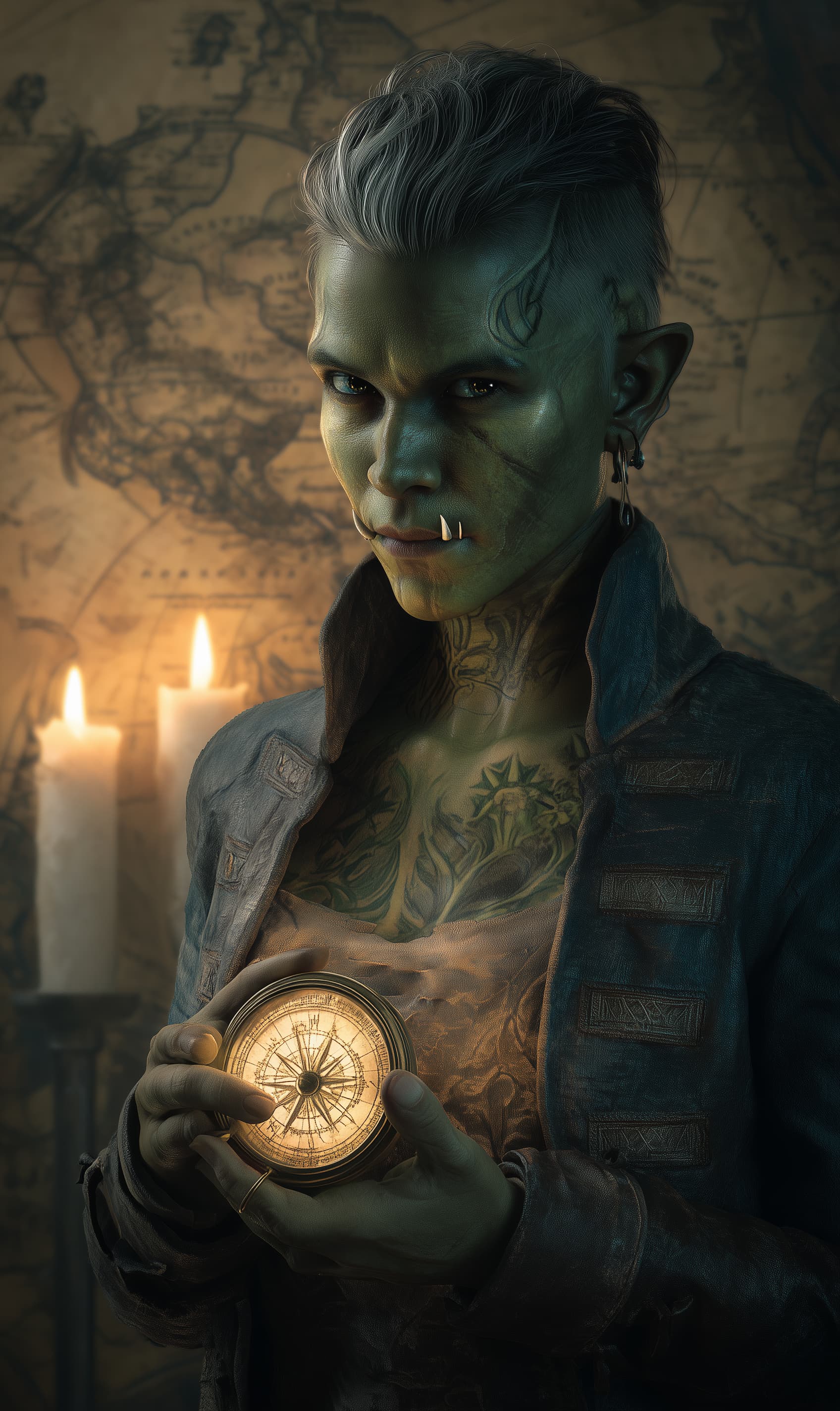 Appearance: Reyna is lean and weather-toned, with short-cropped salt-and-pepper hair, sea-etched green eyes, and a series of swirling tattoos along her forearms resembling wind currents and celestial lines. She dresses in a well-worn captain’s coat reinforced for wind and salt, layered over sailor’s leathers. Her left tusk is chipped, and her weathered compass—heirloom and holy relic both—never leaves her side.