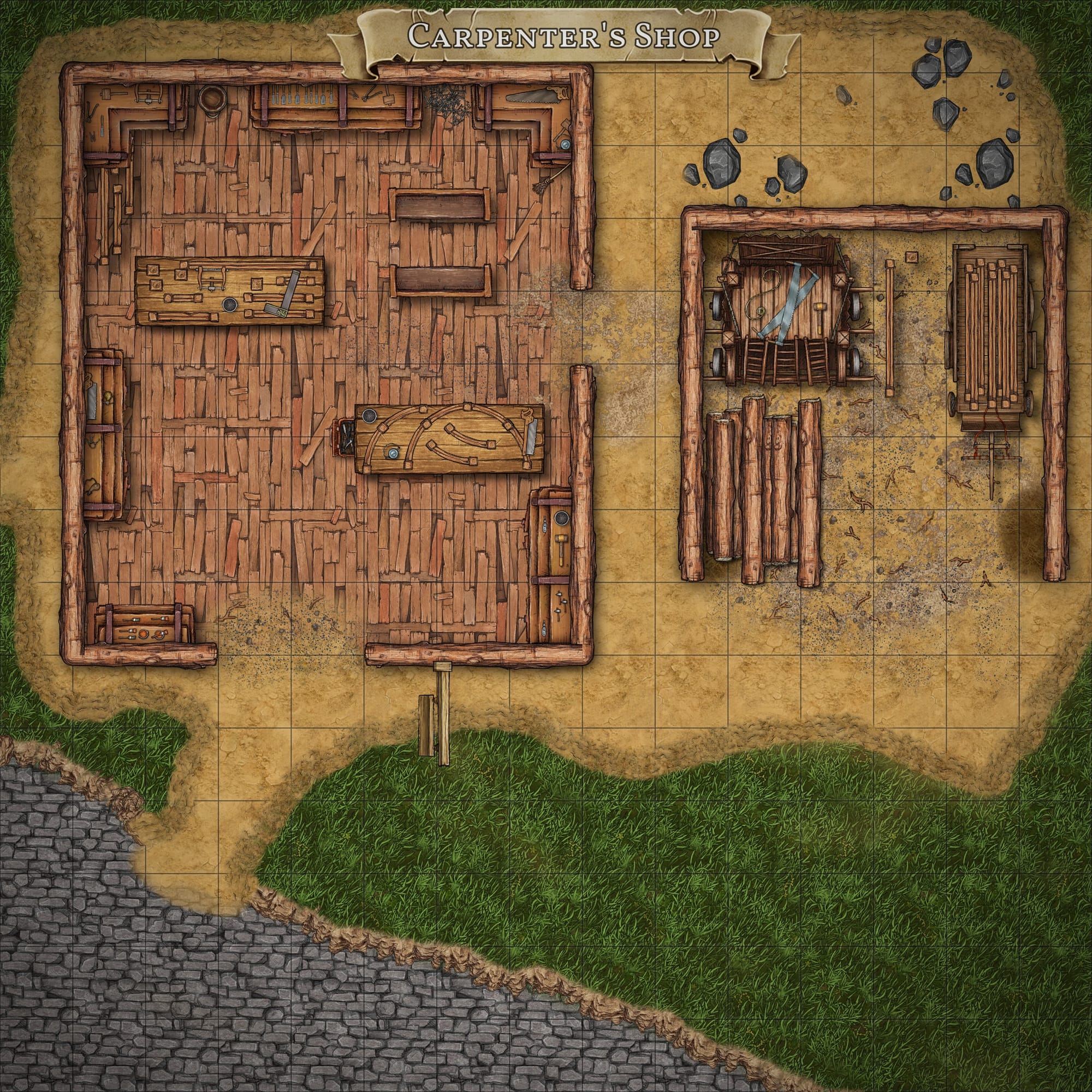 Whether the players are visiting to commission repairs for a damaged structure, gathering supplies for a siege defense, or investigating sabotage to the town’s construction efforts, the yard provides both narrative weight and tactical complexity. The workshop layout encourages creative movement and problem-solving, rewarding characters who leverage the environment to their advantage.