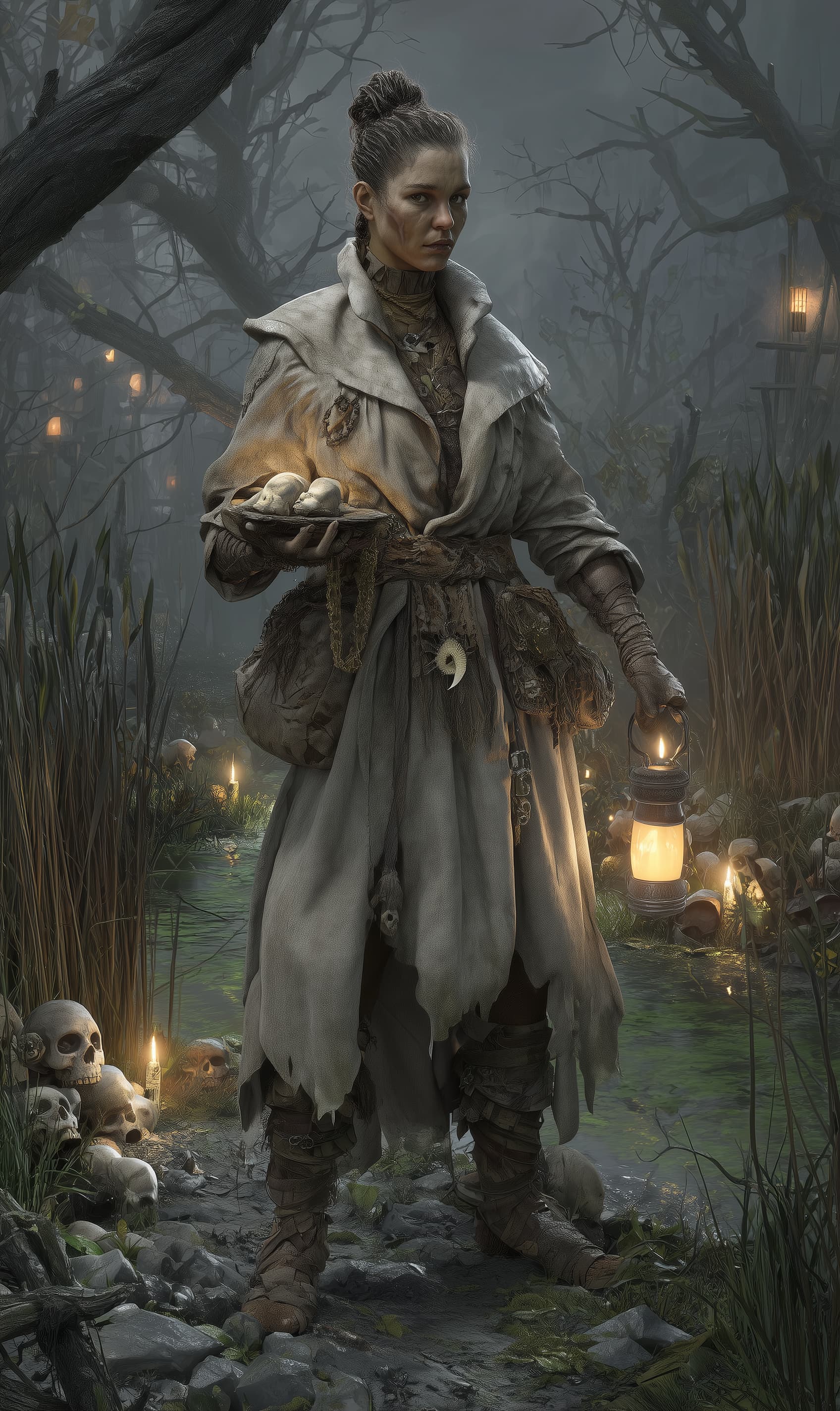 Born to dock-workers in Quagdire, Catrin grew up ferrying mourners through flooded lanes to above-ground crypt-rafts. Storms and spring tides often disinter the dead here; Catrin apprenticed under the last bone-mender, learning to identify families by their tokens and to rebury respectfully before rumor turns to haunting. She keeps meticulous ledgers of resting places and token-matches, mediating quarrels when brine has jumbled the lineages. Catrin doesn’t judge—she restores. In a place where the swamp takes as quickly as it gives, that matters. (Stilted living, boat travel, and artisanal culture are hallmarks of Saltspray Swamp and Quagdire.)