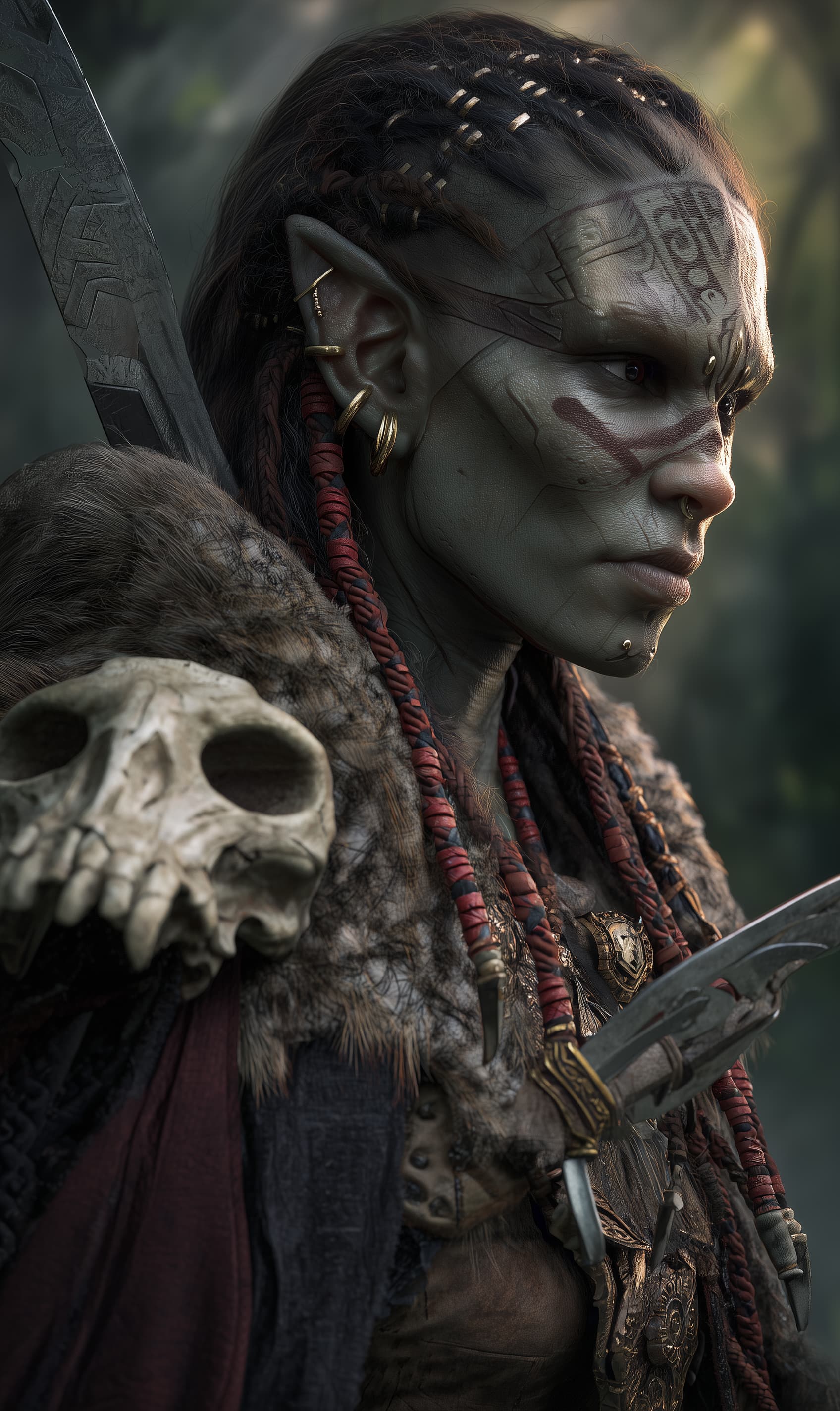 Appearance: Cerryn stands tall and lean, her olive-gray skin mottled with old scars and ritual tattoos—faded ochre symbols that run across her jawline, collarbone, and knuckles. Her long black hair is tied in a tight braid, adorned with small red beads—one for each creature she's slain in her vendetta. She wears a patchwork cloak of beast hides, and her eyes glint like wet obsidian under low light. A massive bone-handled greatknife rests across her back, etched with tally marks.