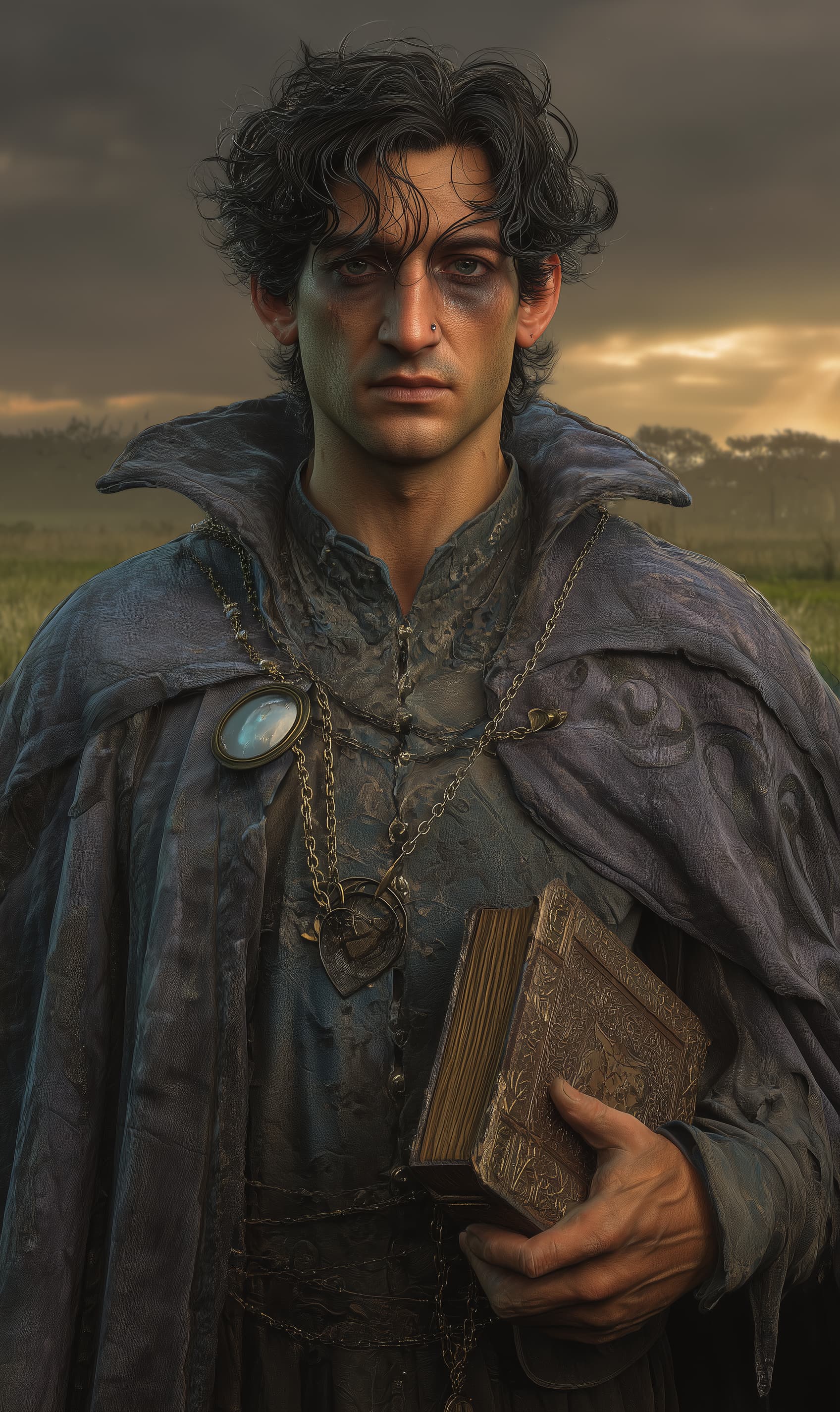 He dresses in practical, travel-ready wizard’s robes: layered slate-blue and soft gray fabrics belted at the waist, with subtle stitched patterns of crescent moons and eyes along the cuffs and hem. A narrow, sleeveless overcoat in deep violet bears a few burned-on sigils from experiments gone wrong. A brass monocle, etched with tiny concentric circles, dangles from a chain in his pocket; he lifts it to one eye when studying dreams, maps, or people. His spellbook is a reinforced leather journal strapped to his hip, its edges stuffed with loose parchment. A small pouch of dried herbs and dream-charms—feathers, silver thread, pressed blossoms—hangs from his belt.