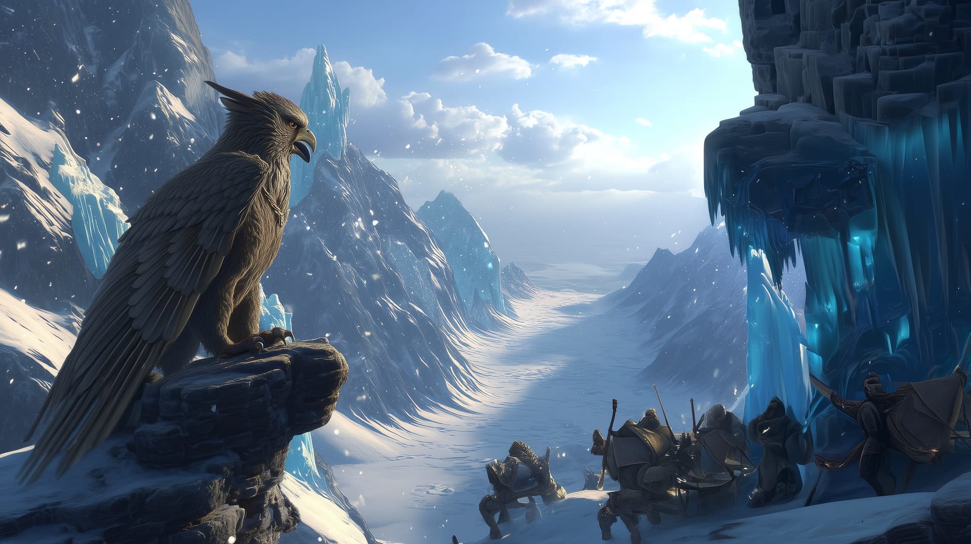 High above the wind-scoured passes, Crownfeather rules a south-facing sun shelf—a rare ledge warmed by morning light. She leads a mated pair and two yearlings, trading airspace with rocs and yetis by ritual display rather than constant bloodshed. Salted meat laid at the cairn buys safe passage; drums and crossbows do not. Caravaners whisper that she can read fairness: she harasses poachers, ignores shepherds who leave tribute, and stoops on manticores with ancestral fury. To locals, she is both storm and stewardship—predation contained by pride.