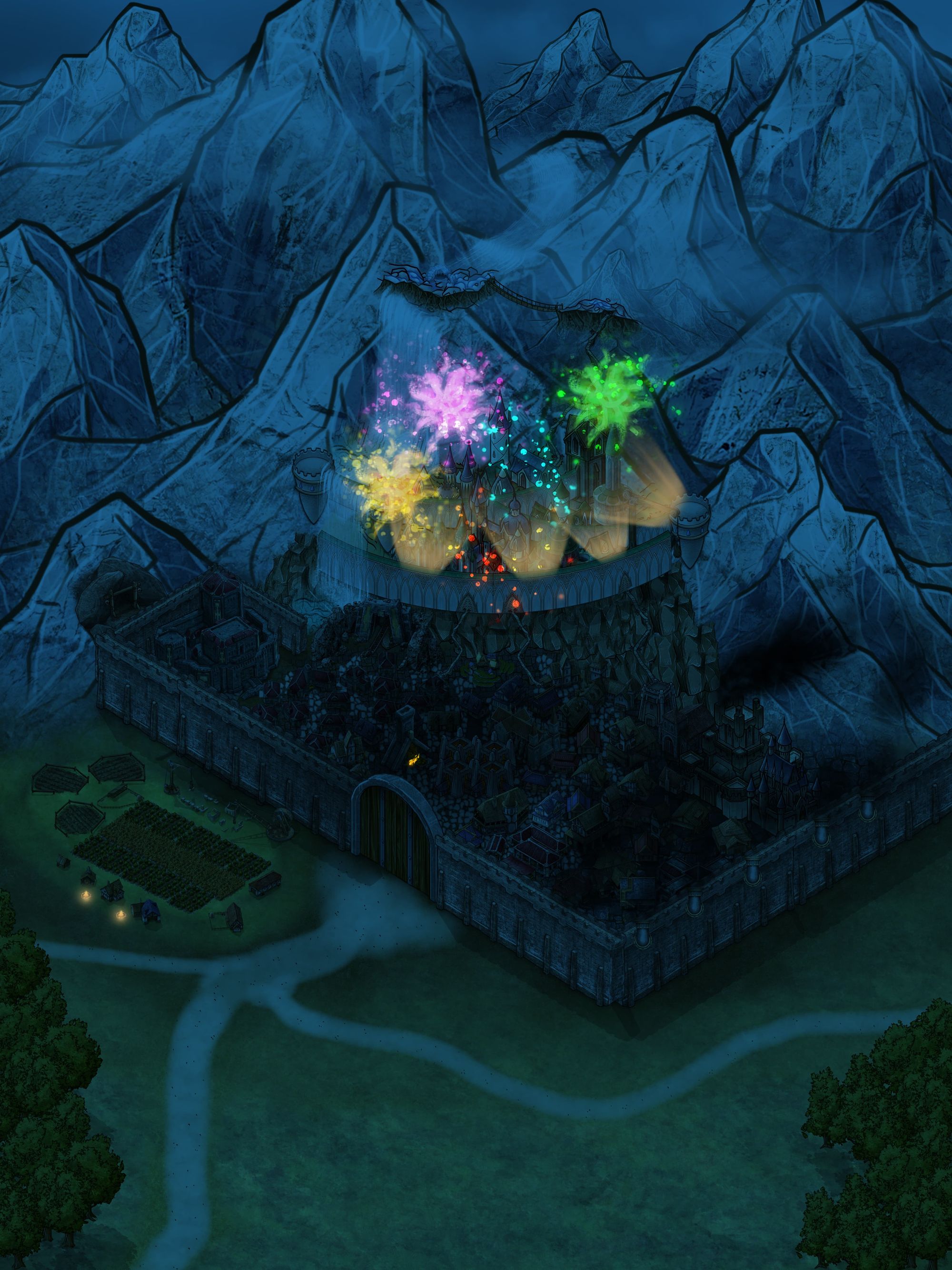 As the party is walking through the Ironlot Streets, an enormous blast ruptures the silence, shaking the southeastern region. A hundred yards away, sharp fragments of rock scatter across the street. A vast smoky plume emanates from a gaping opening in the mountain's wall.
