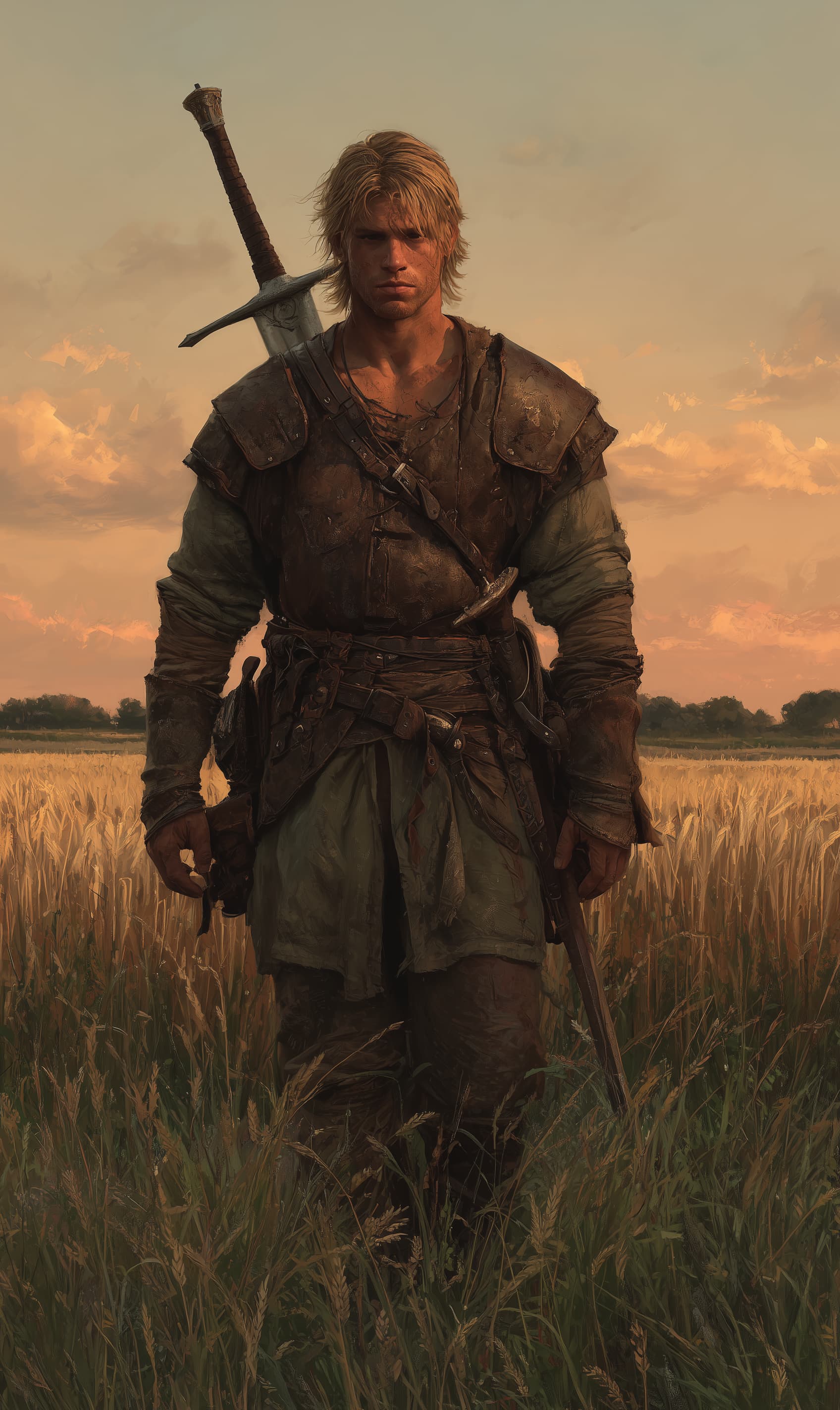 Appearance: Darrin is rugged and broad-shouldered, with sun-darkened skin, a thatch of straw-blond hair, and a lined face that betrays hard years in the field. He wears patched leather armor over a faded green tunic, his pants tucked into worn farm boots. He has the rough charm of someone who doesn’t talk much, but means every word he says.