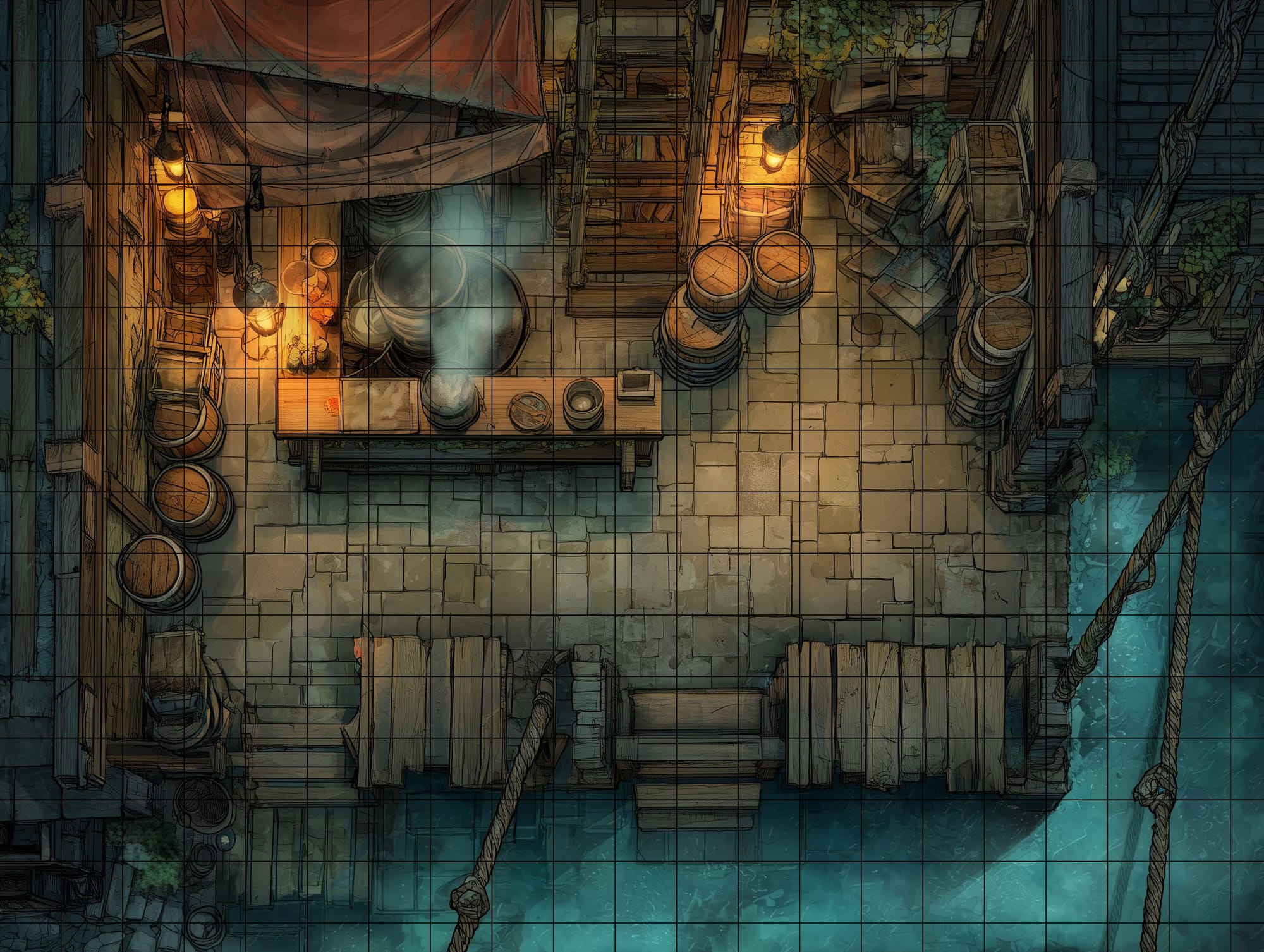 At the heart of the stall sits a long worktable and a steaming brine pot, sending pale vapor into the air in slow curls that blur edges and thicken the light. Lanterns hang low, their glow catching on glass and wet stone, while nearby dock planks and waterline access make the space feel one step from escape—or one step from a plunge. It’s intimate and functional, but not safe: the brazier’s heat, the slick footing, and the tight lanes turn even a small scuffle into something dangerous and fast.