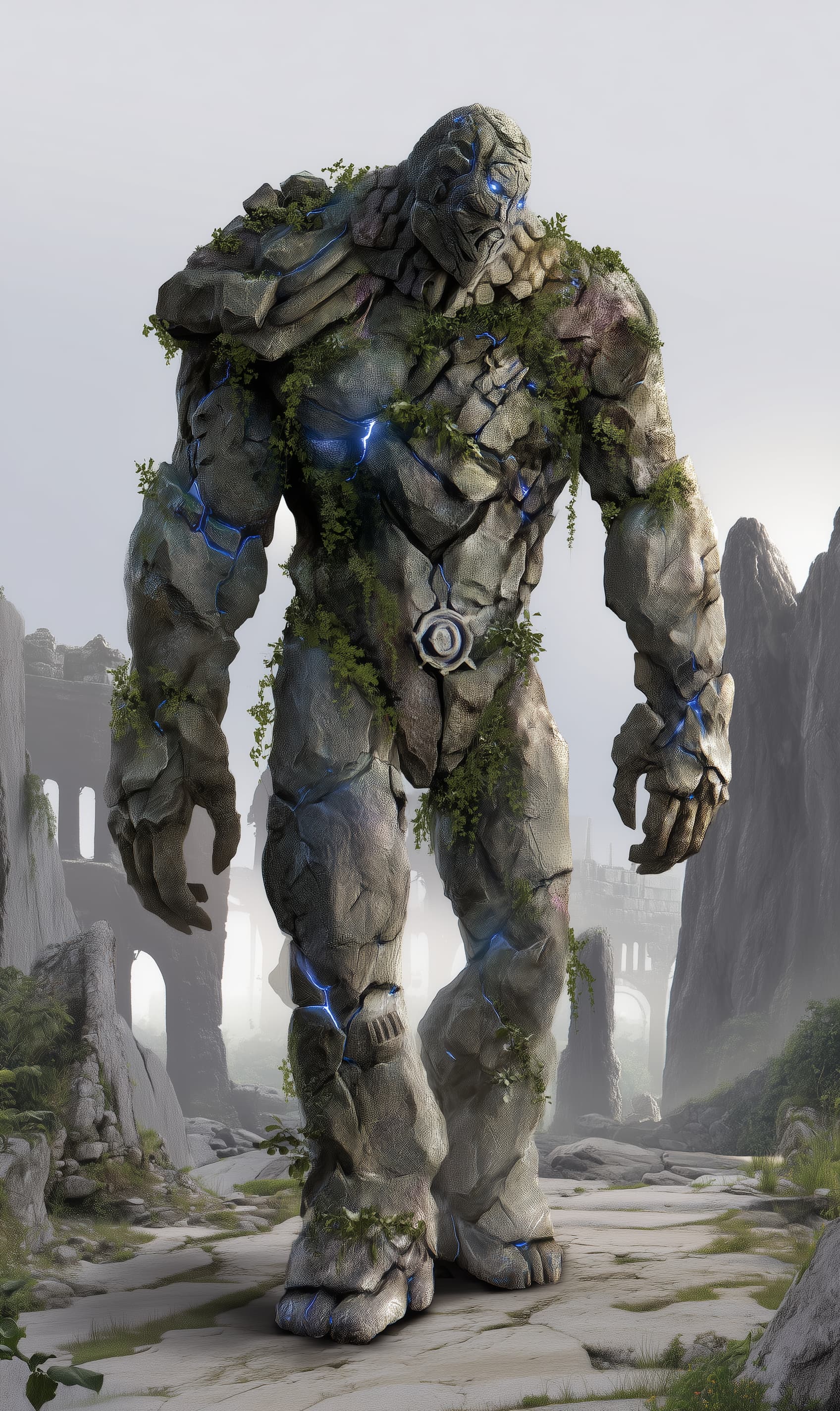 Appearance: Dolmen is massive—nearly 12 feet tall—with a body carved of weathered basalt and ancient rune-etched granite. Moss clings to his joints, and cracks in his stone frame reveal flickering veins of blue crystal light. A heavy, eroded stone mask is fused into what was once his face. Where one shoulder bears the sigil of a sun long extinguished, the other is broken—leaving only the remnants of a forgotten order.