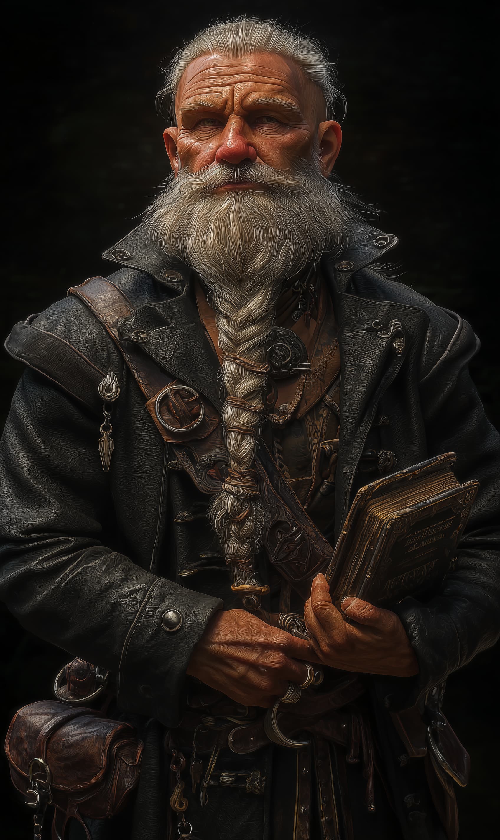 Appearance: Dornan Saltledger is a well-kept dwarf in a place that tries to sand everyone down. He is stout and broad through the chest, with a neatly squared beard braided into three tight cords, each bound with a small brass ledger tag. His hair is kept short and combed back with oil that smells faintly of citrus and salt—practical in sea wind, but still a choice.
