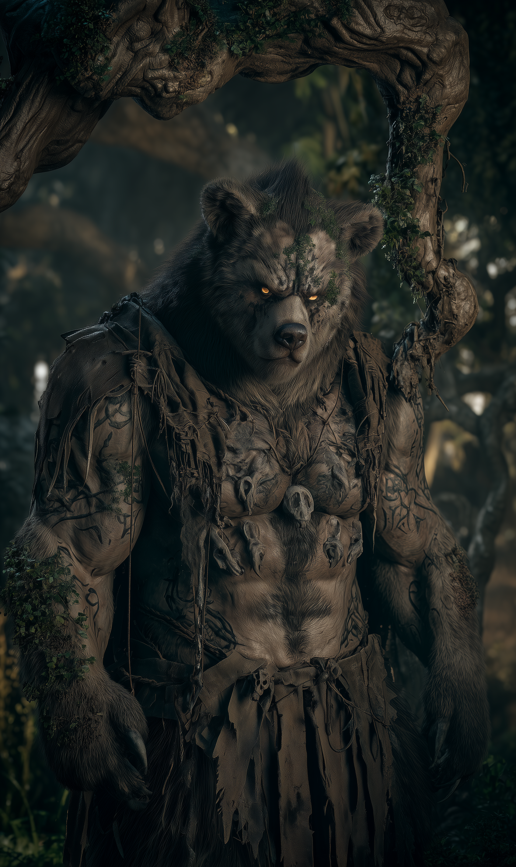 Appearance: Towering even in humanoid form, Durnek’s body is a weathered monument of sinew and ritual scars, his granite-toned skin cracked with lichen and mossy growths. His eyes are sunken and amber-hued, flecked with crimson during times of rage. A bear-hide mantle clings to his shoulders, stitched with thorns and old bone fetishes. When transformed, he becomes a monstrous werebear with bark-tough fur and stone-like claws that hum faintly with druidic magic. His voice is gravel—deep and restrained.