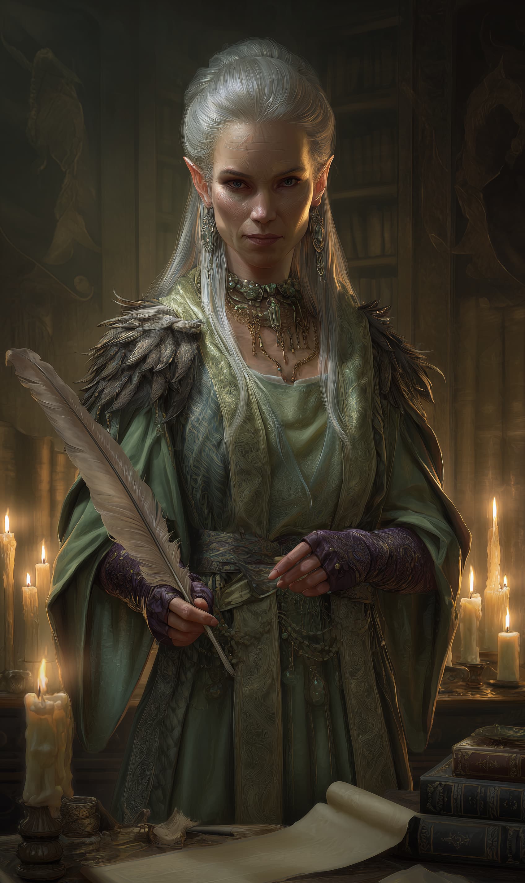 Appearance: Elanriel is tall and willowy, with the ageless elegance typical of high elves. Her skin is pale parchment-gold, and her hair flows like spun silver, held back with a jade pin. She wears a robe of soft forest green and ink-stained gloves, and her fingers are adorned with brass rings etched in ancient runes. Her eyes—deep violet—are always scanning, measuring, observing. Her presence is quiet but deliberate, like a finishing stroke on a perfect line of script.