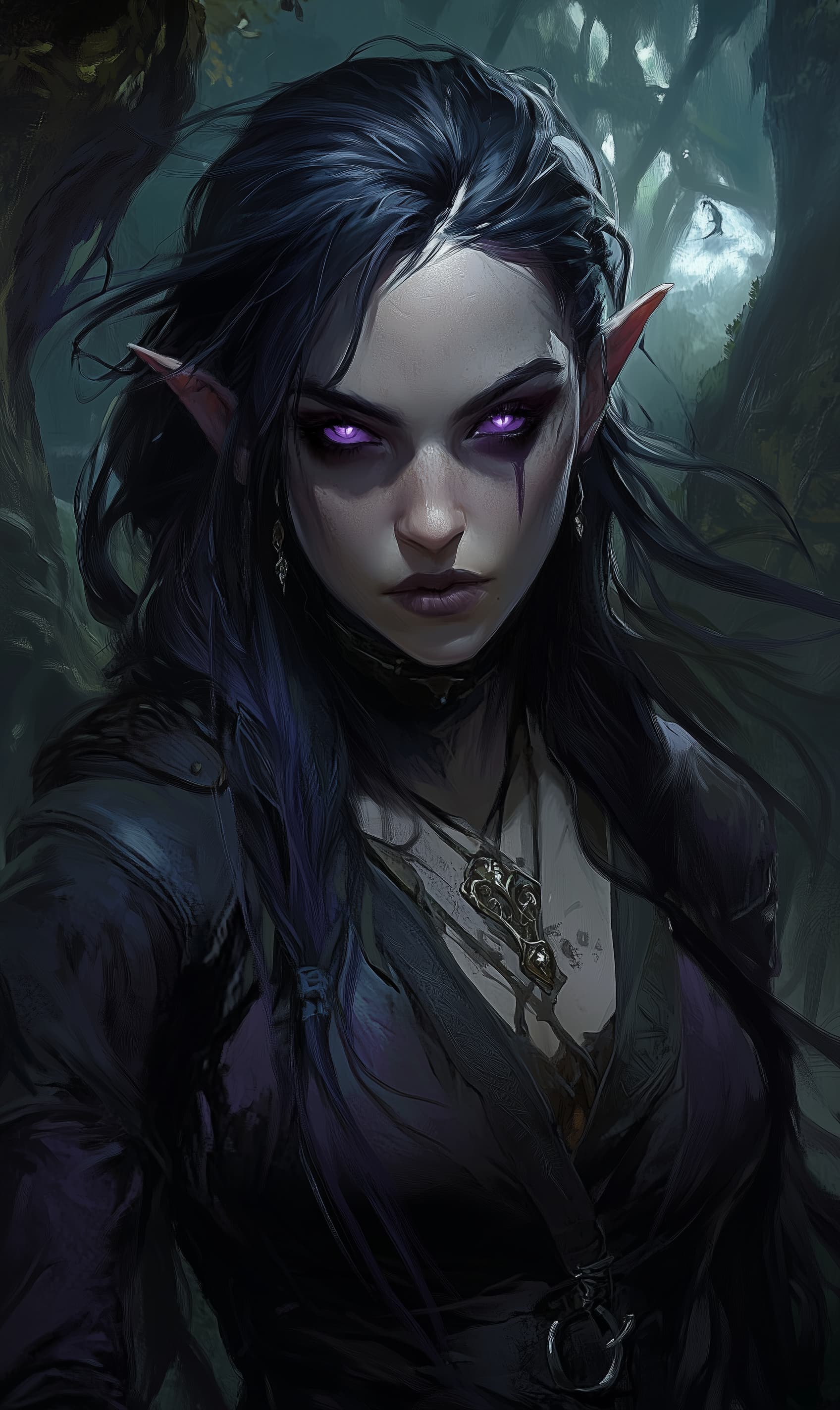 Elaris Sablethorn is tall with ashen-gray skin stretched taut over sharp cheekbones and piercing violet eyes that glow faintly in the dark. Her long, jet-black hair, streaked with white, falls in unkempt waves down her back, often tangled with twigs, moss, or feathers.