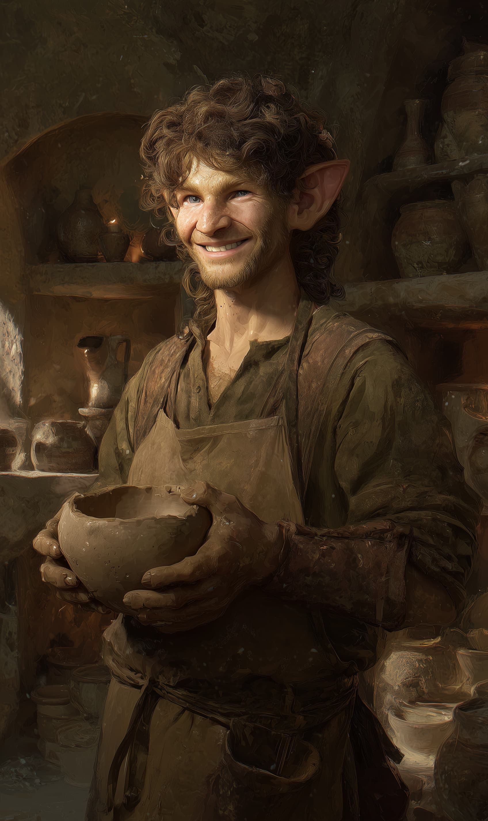 Appearance: Elias is a stocky halfling with wide shoulders and dust-covered clothes. His curly brown hair is always speckled with clay, and he often has a smudge on his nose from absentminded work. His hands are strong but gentle, with short fingers stained a permanent reddish-gray. He wears an apron hand-stitched with old family symbols, and he always keeps a bit of wet clay behind his ear—“just in case.”