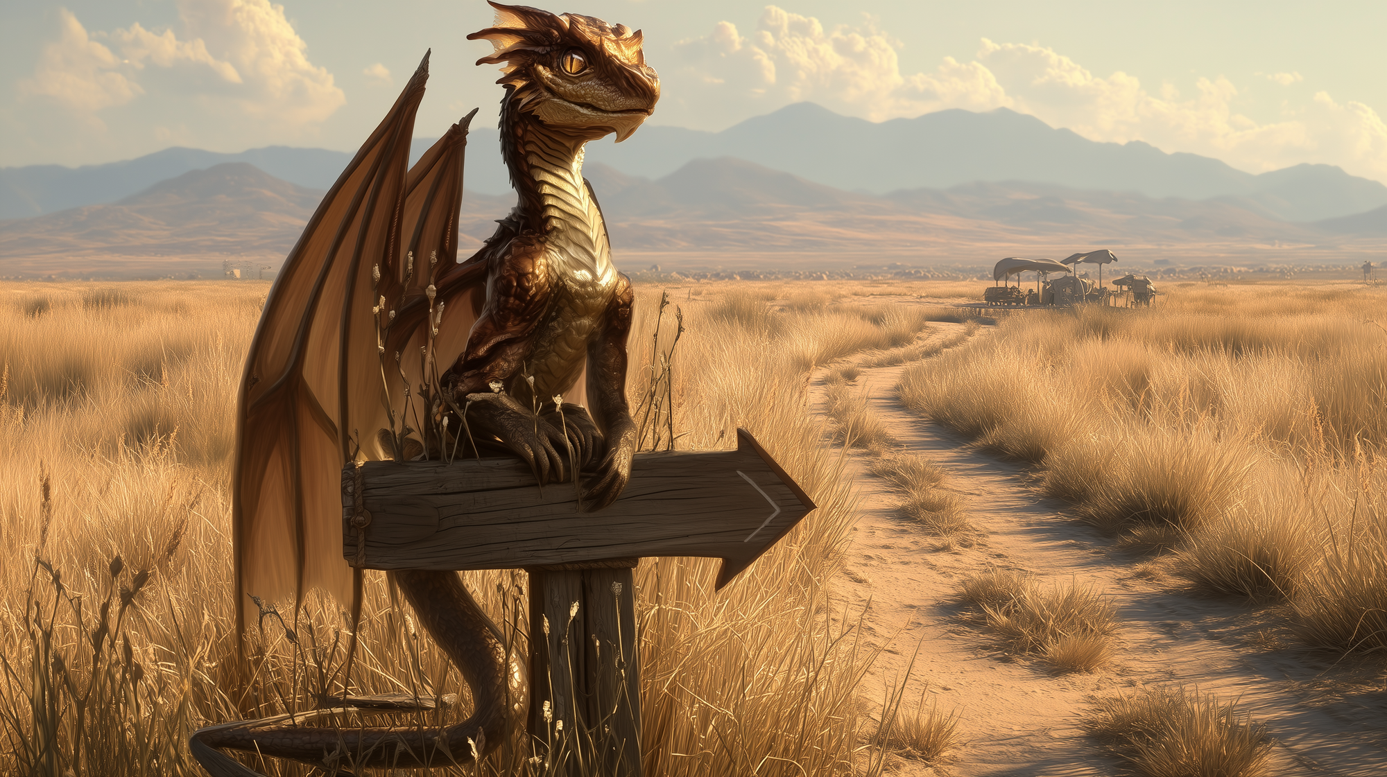 Fizzelwick has appointed himself the unofficial Chronicler of Crossroads at a sun-baked waystation on the edge of the Wanderlust Plains where four major caravan routes converge. He is three years old, roughly the size of a large dog, and has more opinions about regional trade politics than most merchants ten times his age and considerably more years of experience. He does not guard the waystation. He inhabits it — perched on the roof of the water trough shelter or coiled around the signpost, intercepting every traveler who passes through with the focused energy of a creature that has discovered conversation and cannot believe everyone isn't doing it constantly.