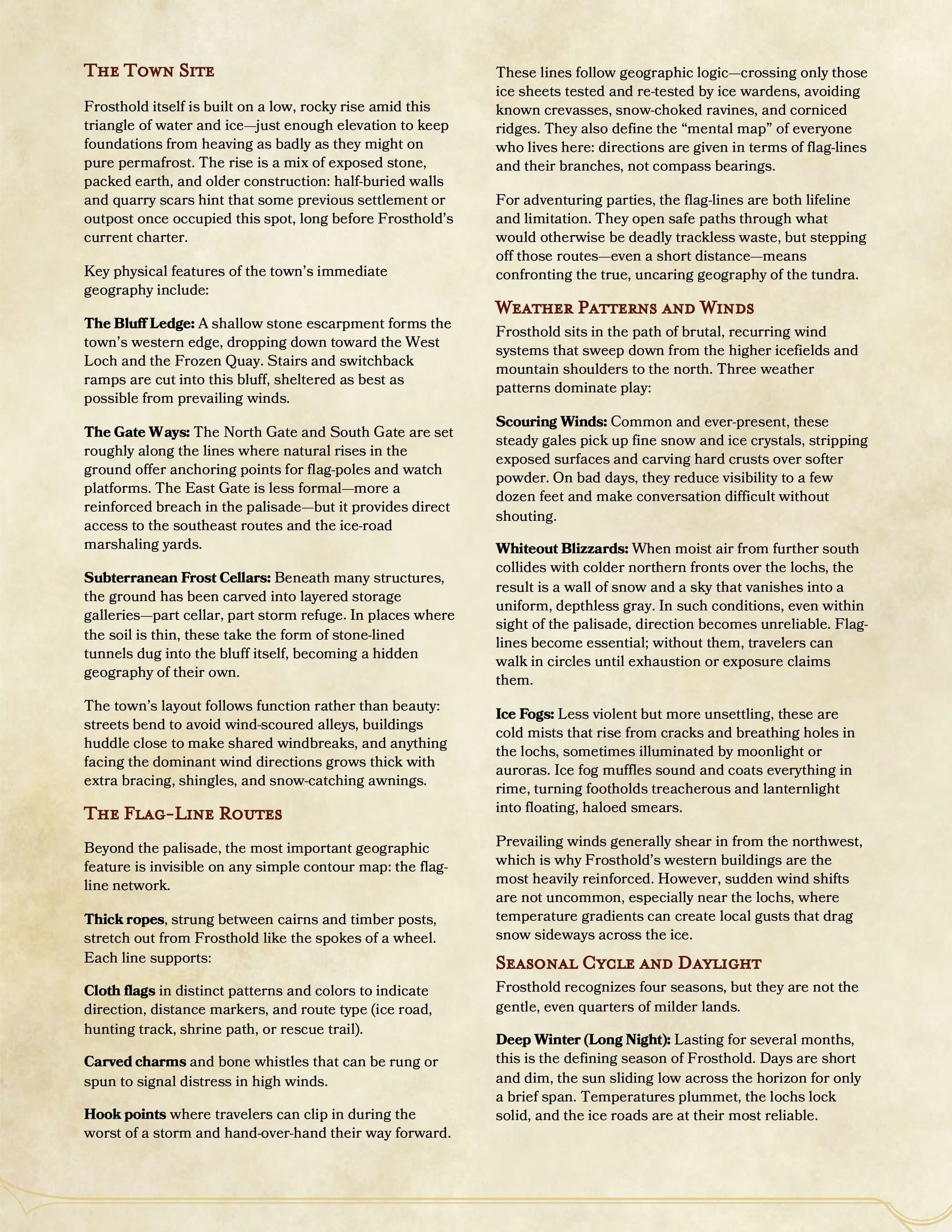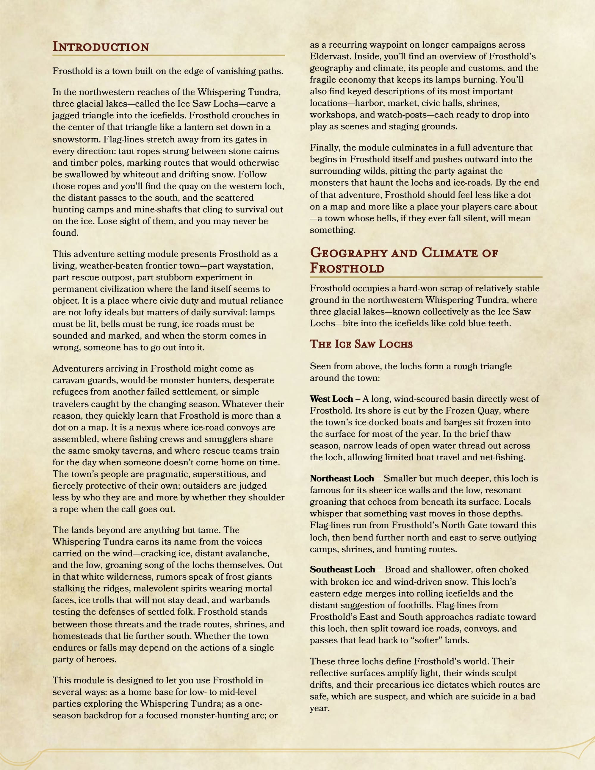 This sourcebook is built to be played, not merely read. It provides a richly detailed sandbox designed for low-level intrigue, creeping dread, moral tension, and escalating danger. Frosthold works just as well as a campaign starting point as it does a remote outpost the party returns to again and again—watching it change, strain, and scar under the weight of events.