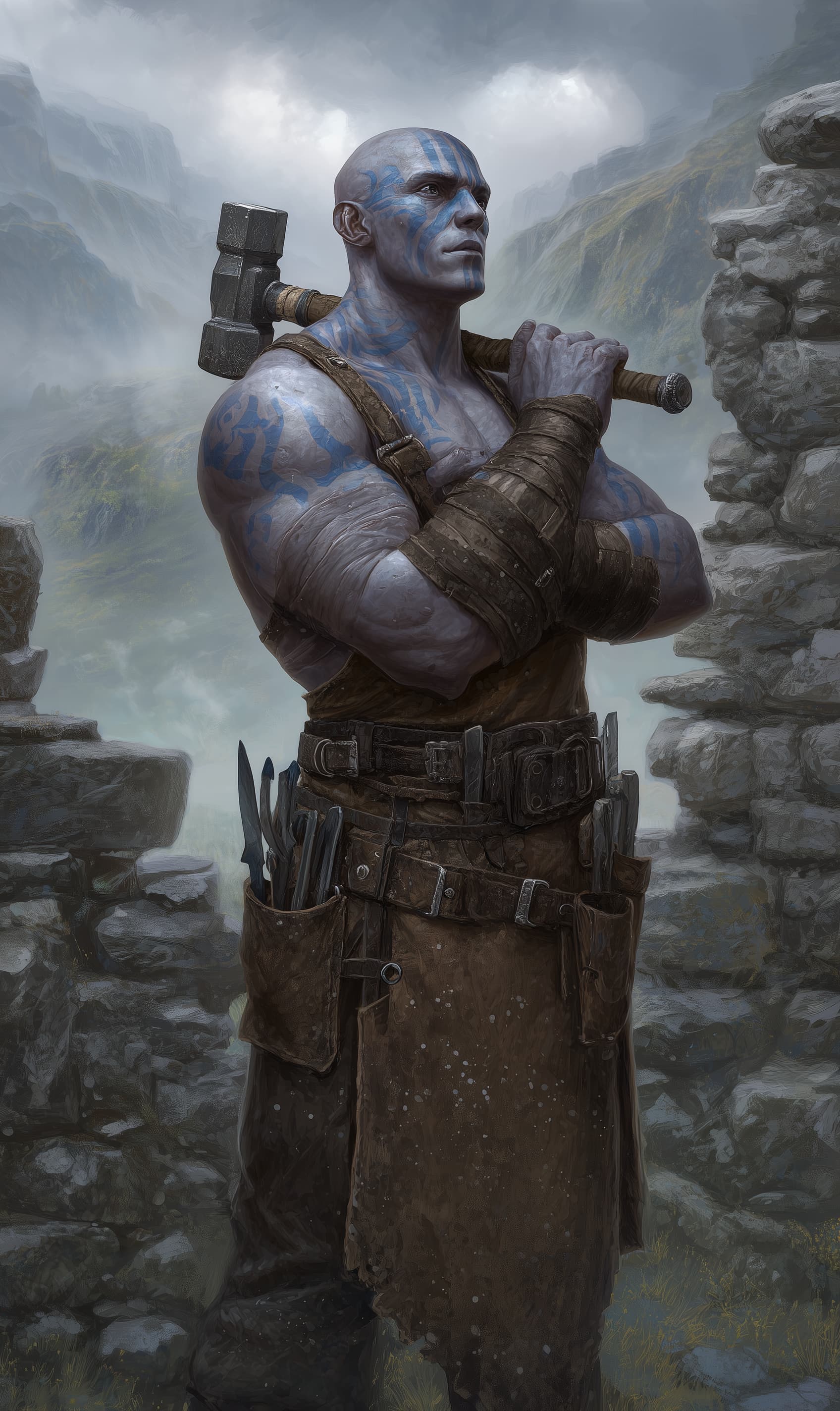 Appearance: Garruk stands tall and broad, with skin like weathered granite and fading blue-gray markings across his shoulders. He wears a thick leather belt filled with chisels and hammers, and his arms are always dusted with mortar or grit. His beard is short and patchy, often flecked with stone dust, and he wears a heavy wool tunic dyed with mineral dyes. His voice is low and steady—like distant thunder across the peaks.