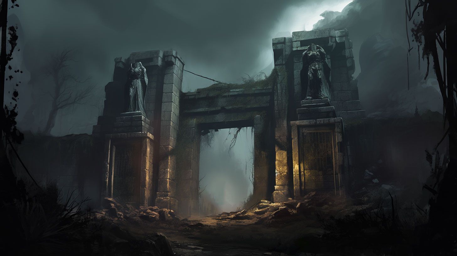 Flanking the gates are two statues of armed guardians, now decapitated and forlorn. Their headless forms lie at their feet, overgrown by creeping weeds and enveloped by the creeping silence that surrounds the scene. Once imposing sentinels, they now serve as broken and voiceless witnesses to the dread that the lands they once guarded now present.