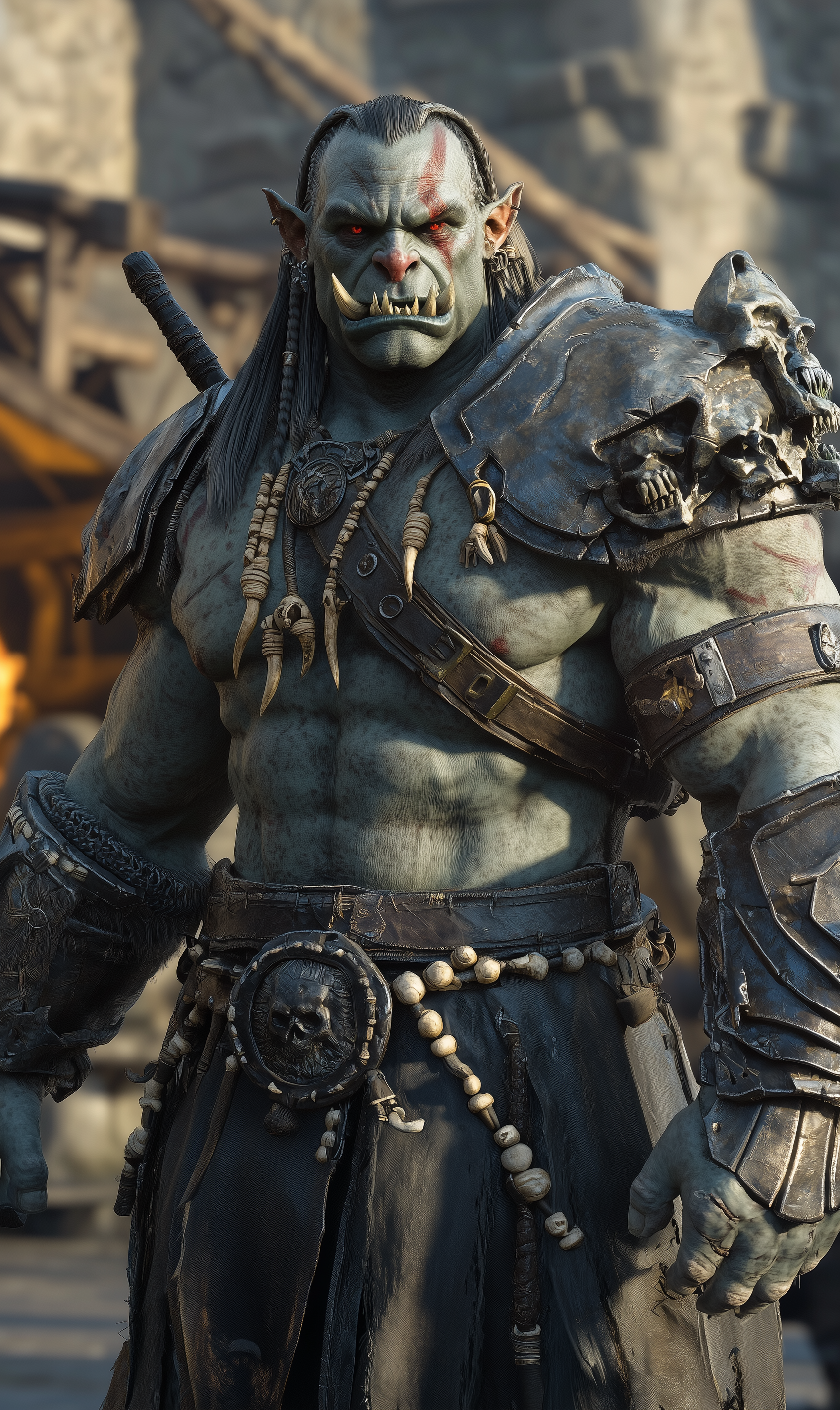Ghorvak is a towering orc with gray-green skin crisscrossed by scars earned from countless battles. His broad shoulders and powerful frame give him an imposing presence, and his fiery red eyes burn with determination and ferocity.
