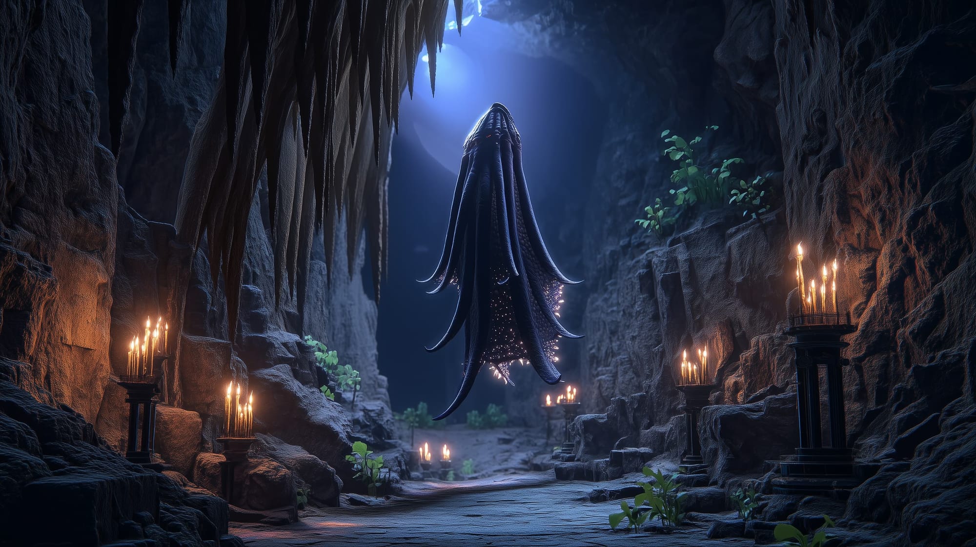 When it stirs, the “stalactite” unfurls into a small, manta-like creature, its conical shell peeling back into a leathery membrane. On the underside, a circular maw ringed with needle-like teeth opens and closes in slow, soundless gulps. A cluster of pale, sightless pits serve as organs for its blindsight, tasting vibrations in the air instead of seeing.