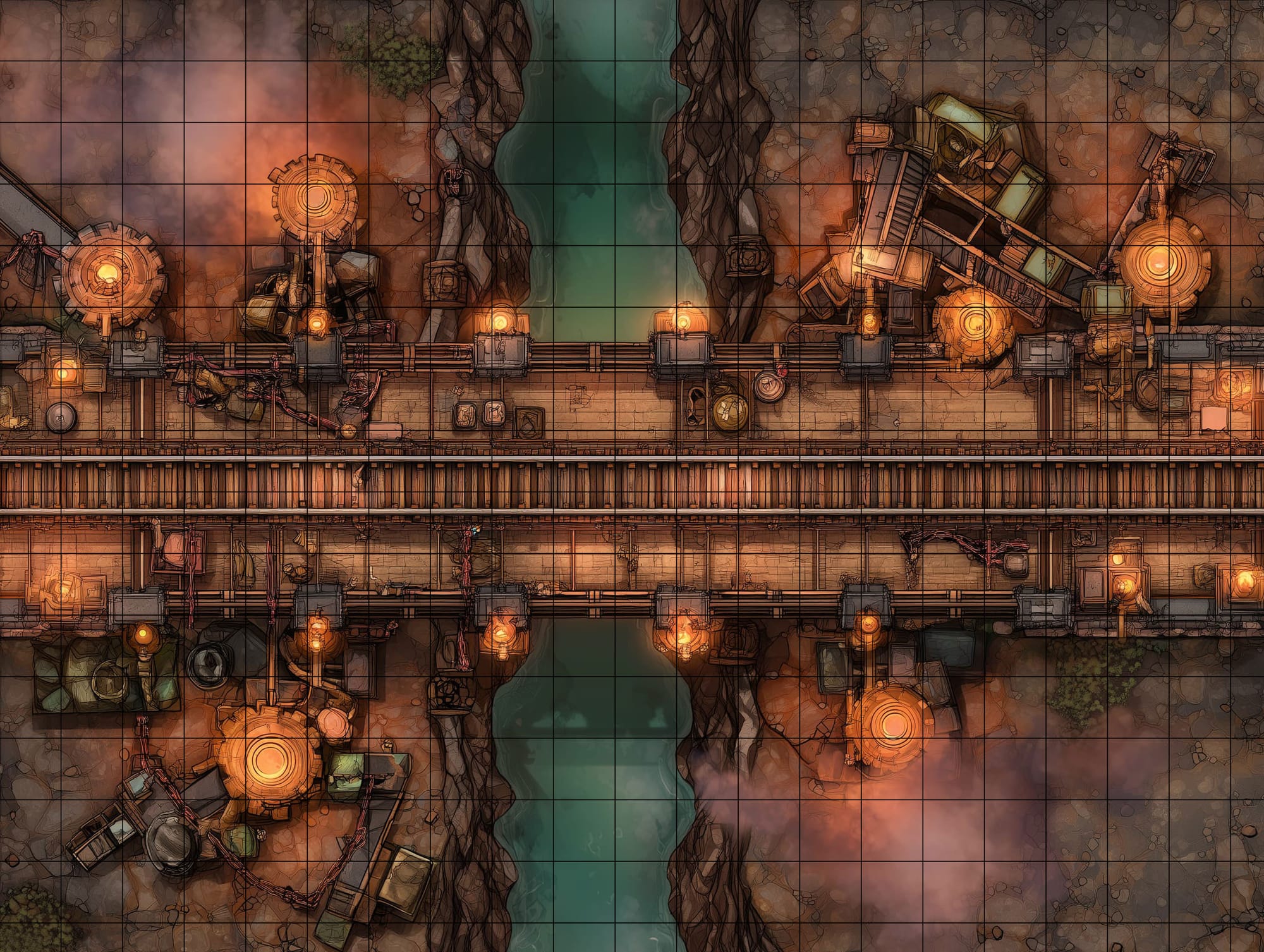This map is built for high-pressure choke point encounters where control, positioning, and sightlines matter more than raw damage. The narrow bridge forces parties into tough decisions—advance into the light, fight for the high ground on the upper catwalk, or drop low to the maintenance lane for cover and flanks. With multiple elevation layers tied together by steep stairs and a single lift cage, it naturally supports ambushes, reinforcements, and multi-front skirmishes without needing extra rooms.