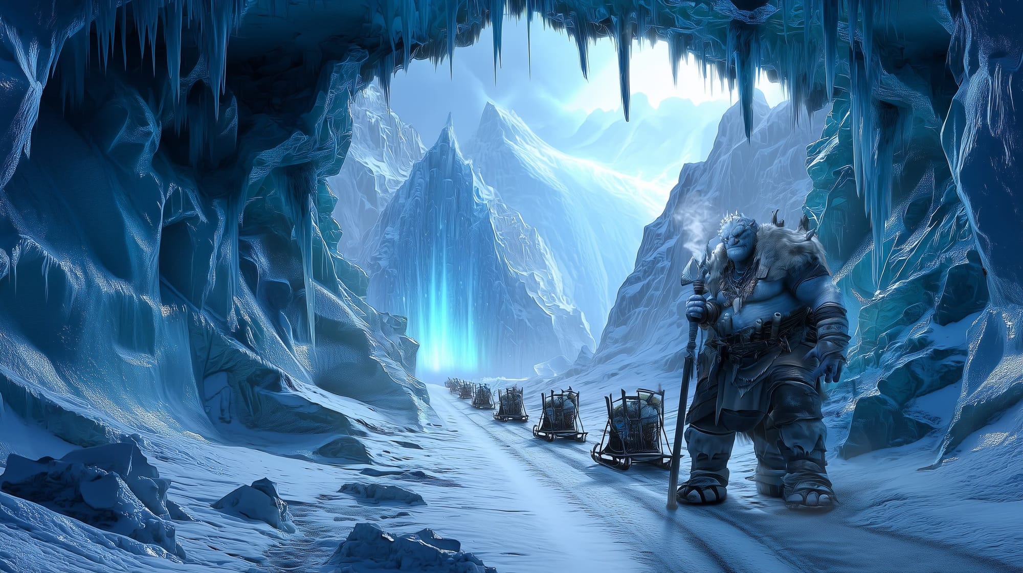 Within Irdryth’s dominion, Gorvak runs the ground game that keeps fear converting into food: tribute trains. He leads ogre teams that haul sleds through the Hunger Dome’s blue corridors, collects village tithes at moon-marked cairns, and “teaches” compliance—first with rules, then with chains. Guard drakes trust his lanes; ice mephits fog his approaches; berserkers swagger behind his wake. To the dragon, Gorvak is a reliable piston in the winter machine: he makes warm things move where she wants.