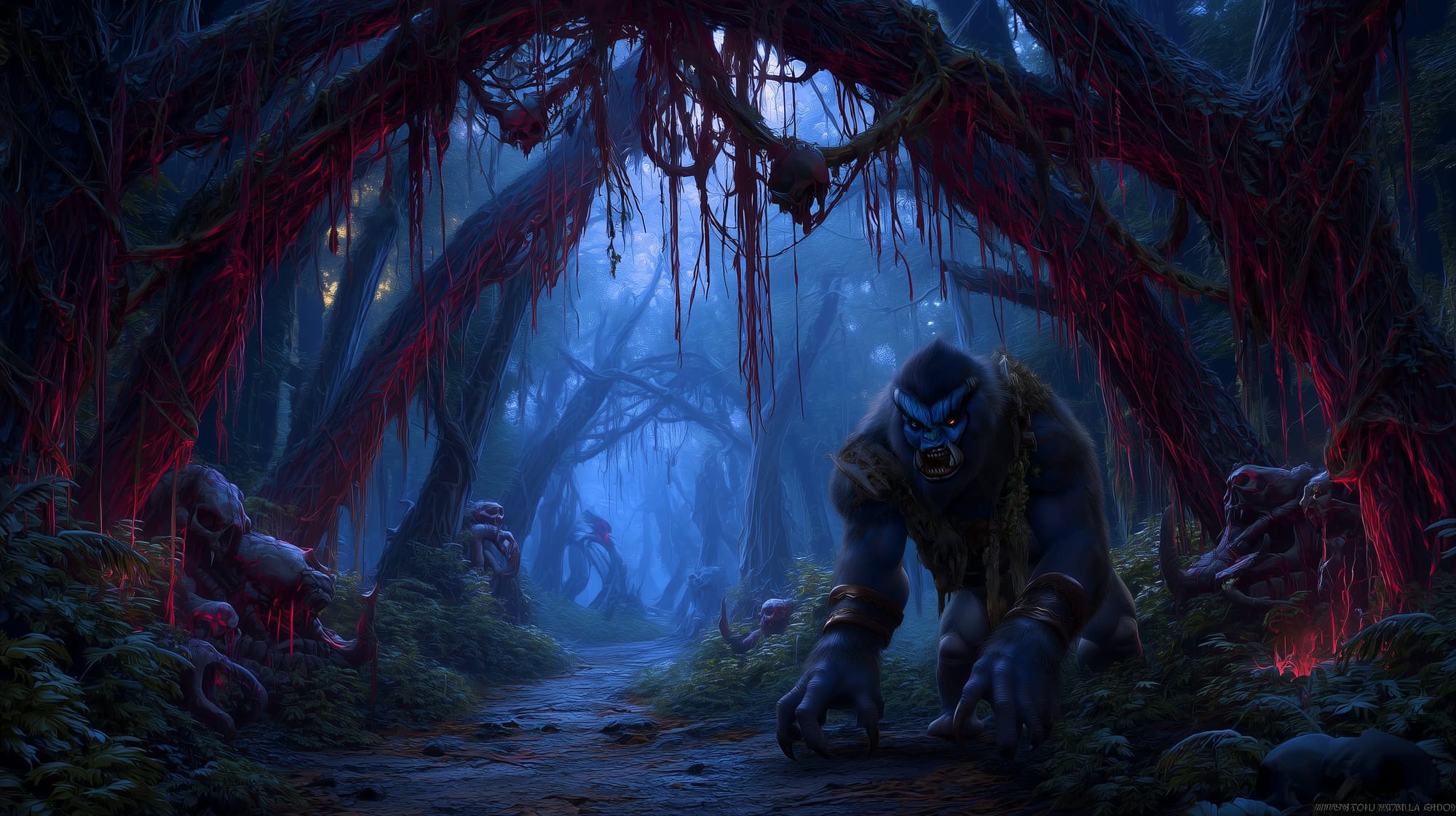 In darker legends, Gor’Vath is said to be claimed by the jungle itself, his demonic savagery bound to ancient groves where blood has soaked too deeply into the soil. These places are avoided not just for fear of death, but because Gor’Vath’s presence warps the land into something hostile to civilization—roots tighten, animals grow feral, and silence becomes predatory.