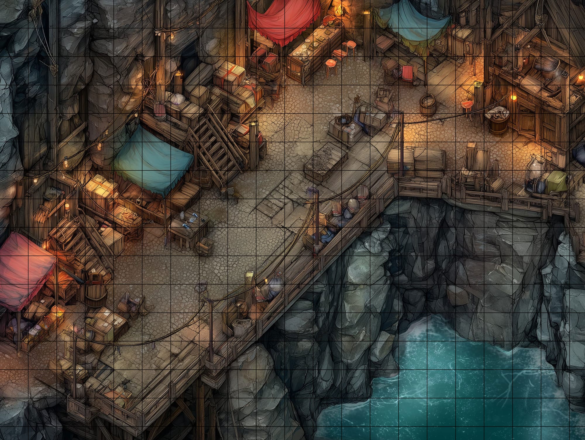 This map is built for dense, street-level encounters where movement is constrained and choices are immediate. The packed lanes naturally create chokepoints for ambushes, shake-downs, and raids, while the abundance of crates, benches, and stall frames provides frequent half cover for skirmishers and ranged threats. It’s an excellent stage for fights that start with roleplay—an argument at a stall, a botched exchange, a guard inspection—and then spiral into chaos as the market turns into a terrain puzzle.