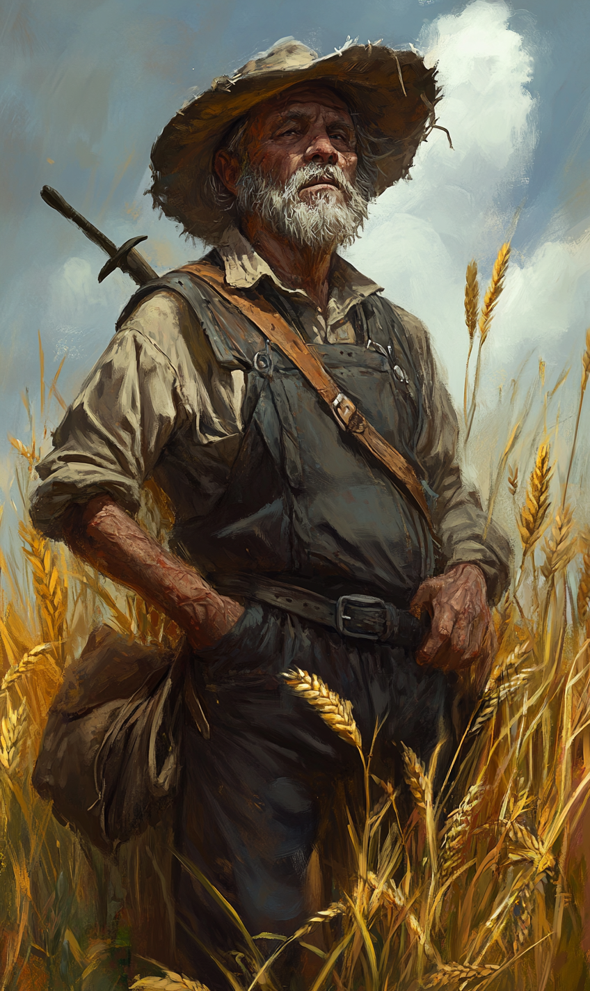 Appearance: Harlan is a rugged man with graying hair, cropped short and often hidden beneath a wide-brimmed hat. His leathery skin, darkened by years of sun and toil, contrasts with his weary, sunken eyes—eyes that seem to carry the weight of untold sorrow. His hands, rough and calloused, often grip a simple walking stick or a rusted scythe, tools of a trade he can no longer fully practice.