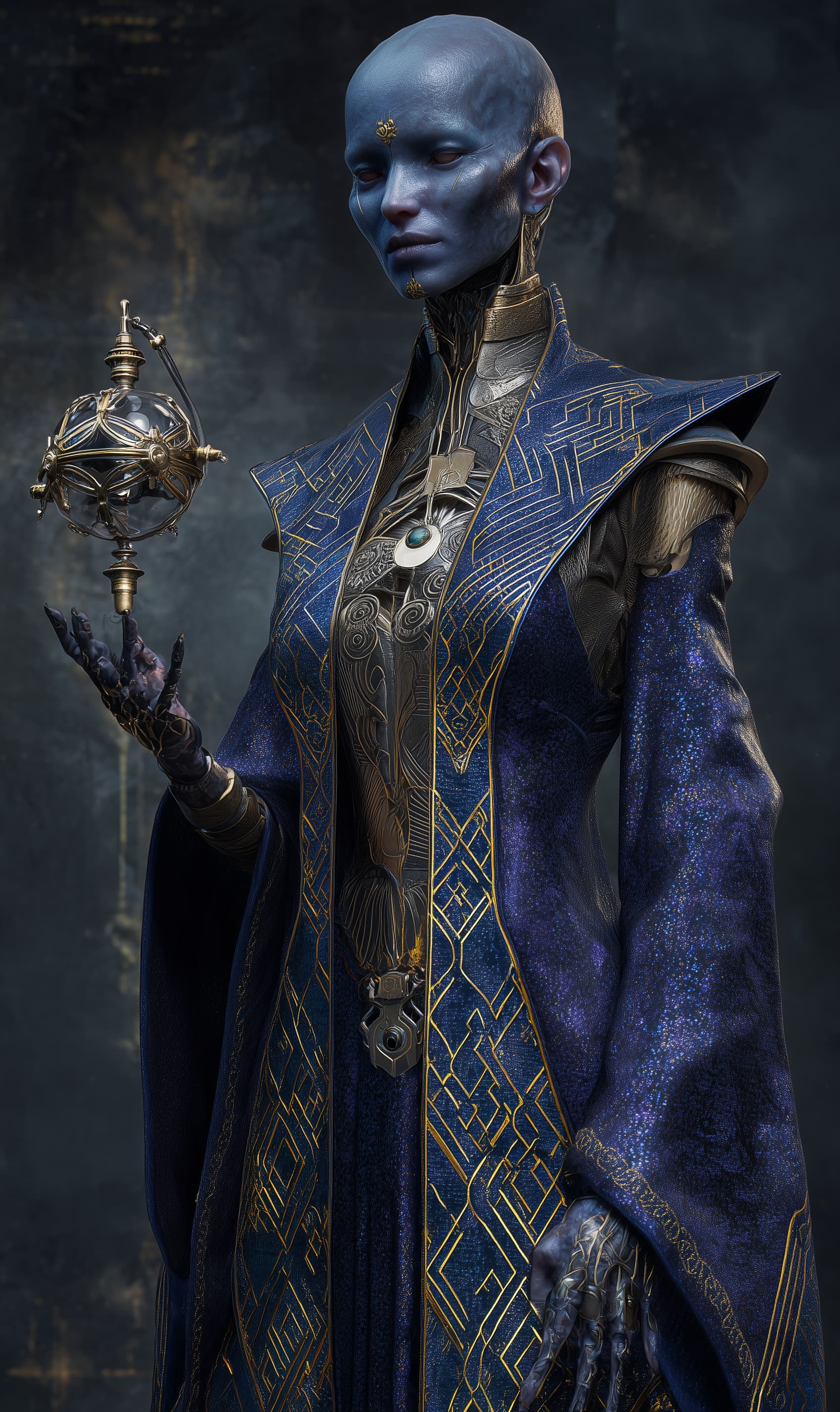 Appearance: Holenna is tall and sinewy, with smooth blue skin and elongated fingers that glide over magical interfaces as if born to them. Her bald head is marked with subtle lines of arcane circuitry—either tattooed or etched through meditation rituals. Her robes are layered in deep indigo and gold-trimmed panels, designed to shimmer in reaction to nearby magical fields. She wears no jewelry, but her ever-present assistant drone—an elegant orb of glass and brass—hovers constantly at her shoulder. Her voice is soft and precise, like the ticking of a chronometer.
