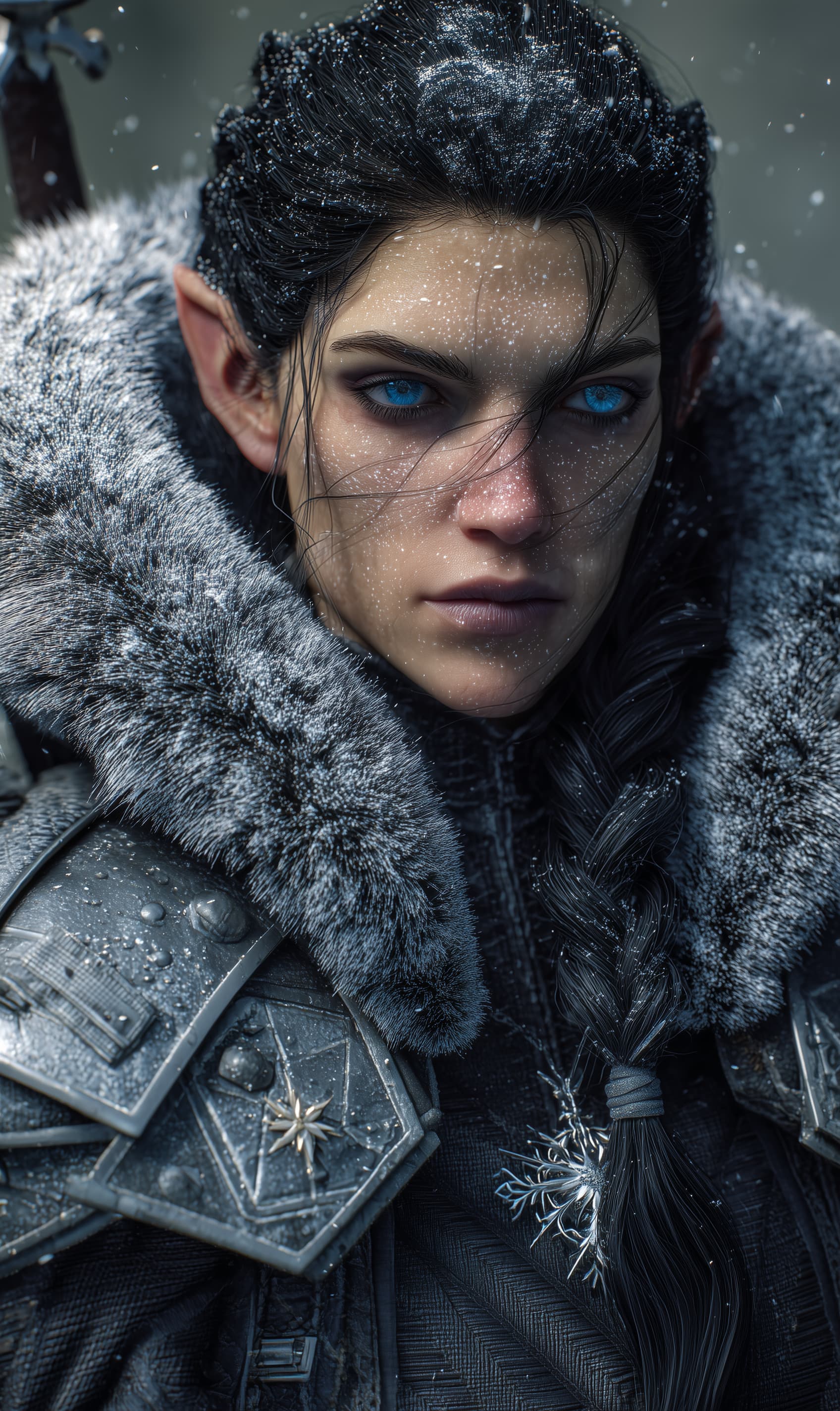 Appearance: Ingrid is in her early 40s with the ageless poise common to half-elves: pale, wind-burned skin; glacier-blue eyes; and a narrow scar across her left cheek from an ice-slick fall as a teen. She wears her black hair in a tight braid under a fur-trimmed hood. Her attire mixes civic dignity and frontier pragmatism—an ink-stained, slate-blue reeve’s surcoat over a quilted arming coat reinforced with hidden studs, sable gloves, and knee-high seal-leather boots. A silver snowflake signet (the seal of Frosthold) hangs on a chain at her neck. A rapier with a utilitarian guard rides at her hip; a ledger folio and wax seals ride at the other.
