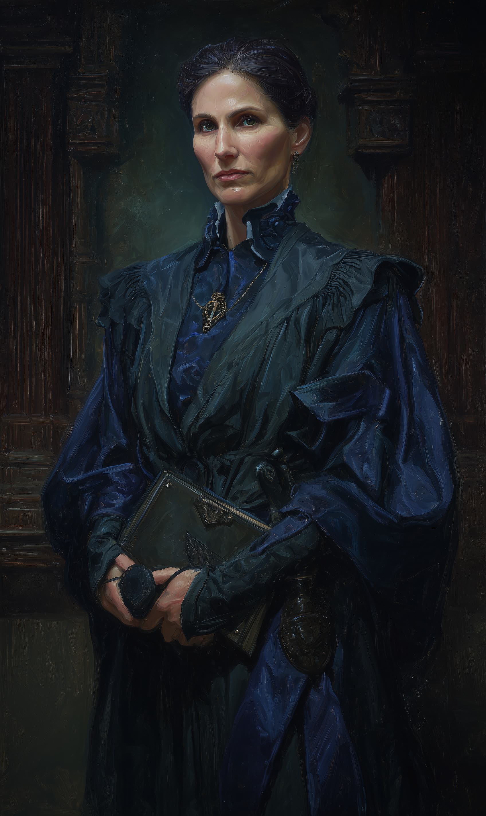 Appearance: Isolde Wren is forty-four, a lean woman with the kind of angular face that conveys authority more efficiently than any judicial robe — sharp cheekbones, a strong nose, and pale grey eyes set in dark skin that carry the particular quality of eyes that have heard thousands of people's worst decisions and have not stopped taking each one seriously. Her dark hair is worn back from her face in a severe practical knot beneath her magistrate's collar — a stiff dark blue band that she straightens by reflex whenever it shifts. She wears the formal black robes of the lower courts with a grey sash and the small bronze scales pin that marks her judicial rank, and she carries a slim leather case of current case files wherever she goes outside the courthouse, held at her left side with the practiced grip of something she stopped noticing she was carrying years ago.