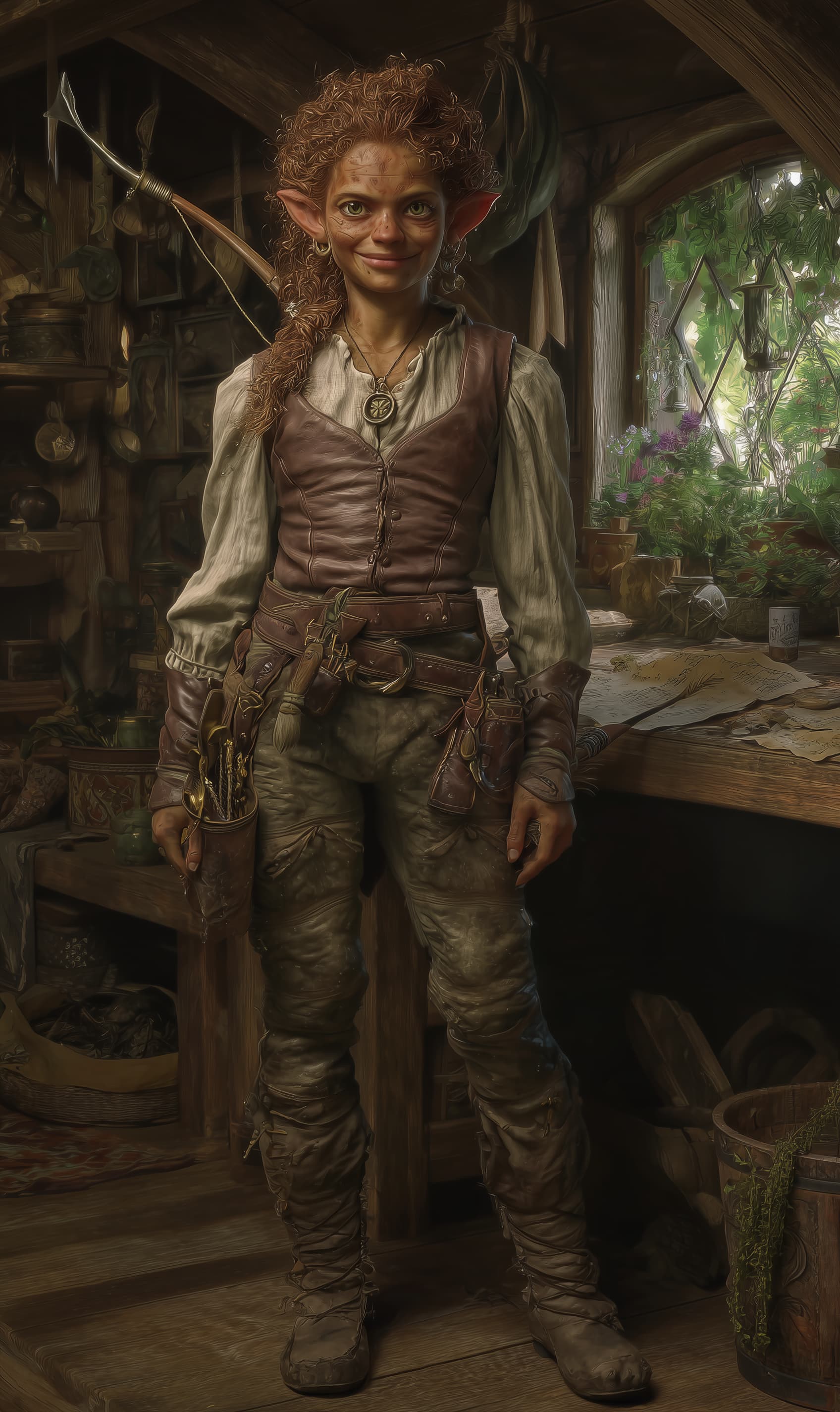 Appearance: Jexi Quickwhistle is small even for a gnome, barely three feet tall, with the wiry build of someone who has spent her life scrambling over wagons, rooftops, and tree limbs. Her skin is a warm, nut-brown, smudged here and there with ink and dust. A cloud of copper-red curls is bound into a loose, lopsided ponytail that seems to be held together by more quills and parchment scraps than actual ties. A dusting of golden freckles dances across her nose and cheeks, and her eyes are a bright, mischievous green that miss nothing.