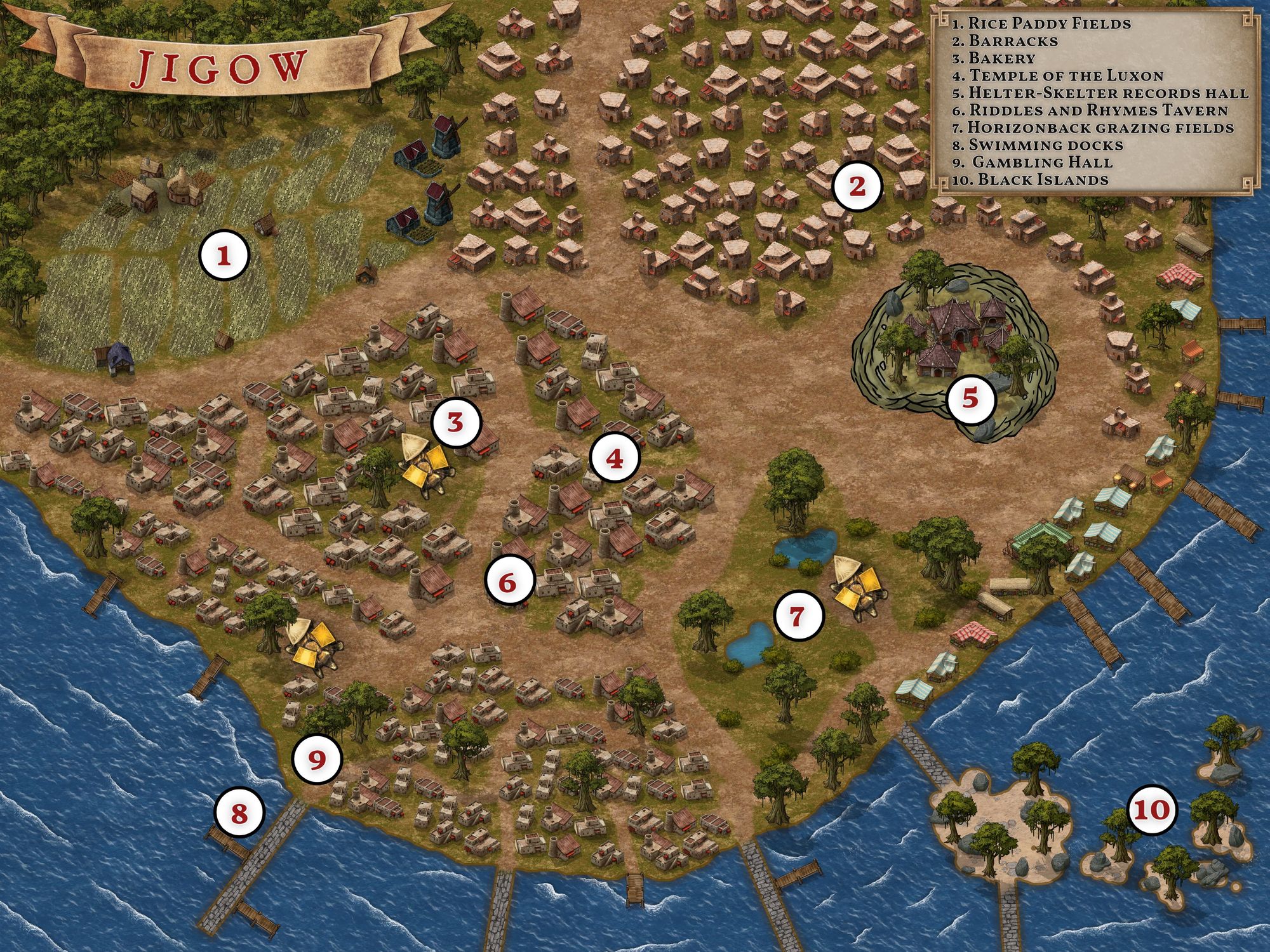 Jigow is not a single centralized city, but rather a group of coastal villages clustered among the shoreline trees. The main docks, known as the Meatwaters, are located on the westernmost shore, where a thriving marine ecosystem supports the fishing industry. The central villages, named the Jumble, are slightly further from the coast, built within the enormous mangrove trees and on the backs of horizonback tortoises that serve as mobile homesteads. The eastern fringes, known as the Wetwalks, consist of huts and shacks on stilts over the low wetland patches where grains are grown in paddies amidst the reeds.