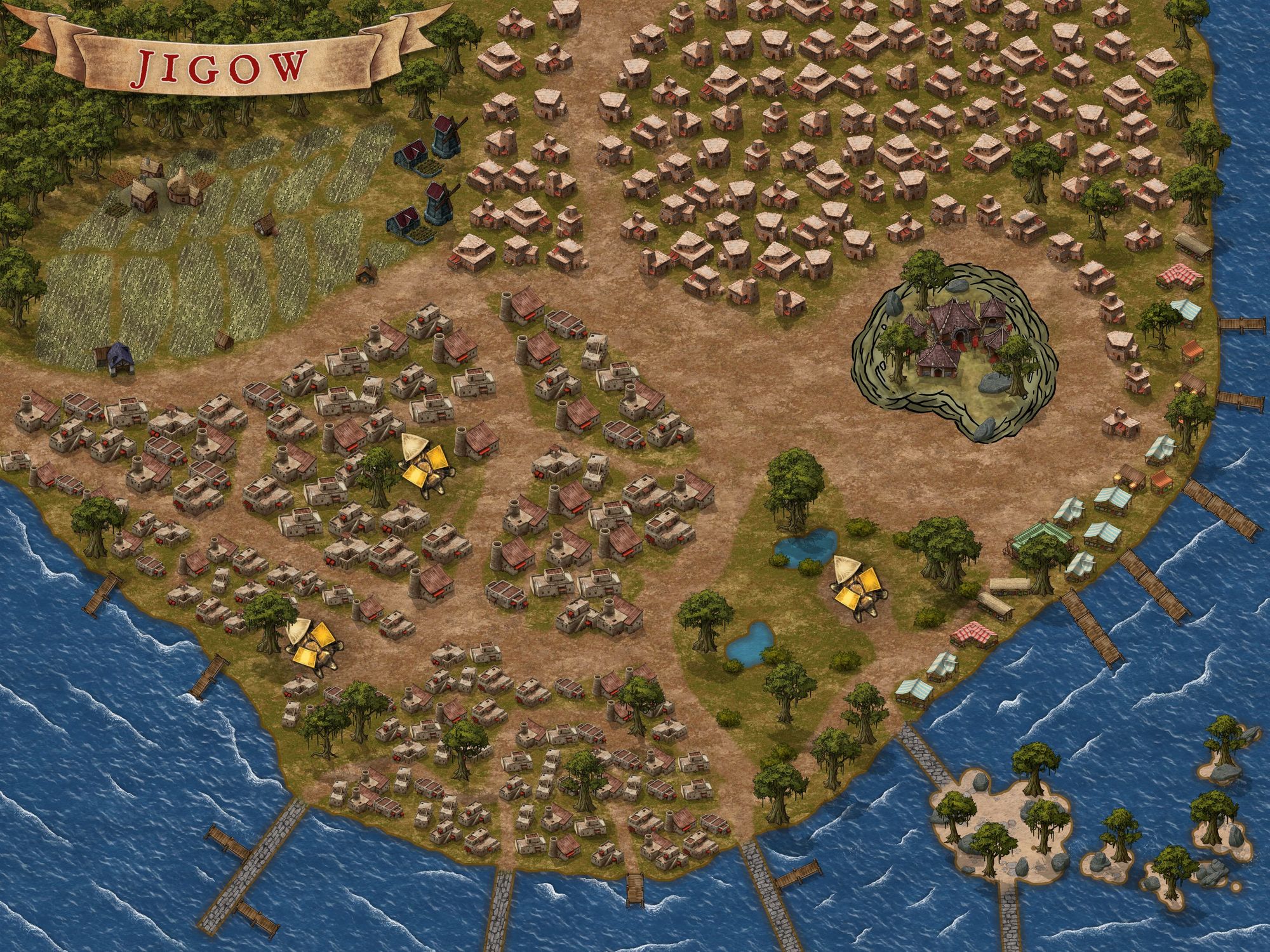 The coastal city of Jigow emerged from these talks, rapidly growing to become an essential source of seafood within the dynasty. Its people are powerful hunters, cunning fishers, and tireless crafters who span both banks of the Emerald Gulch Sea and the northern Ifolon River. As a symbol of the dynasty's expansion and influence, Jigow is an important hub of commerce.