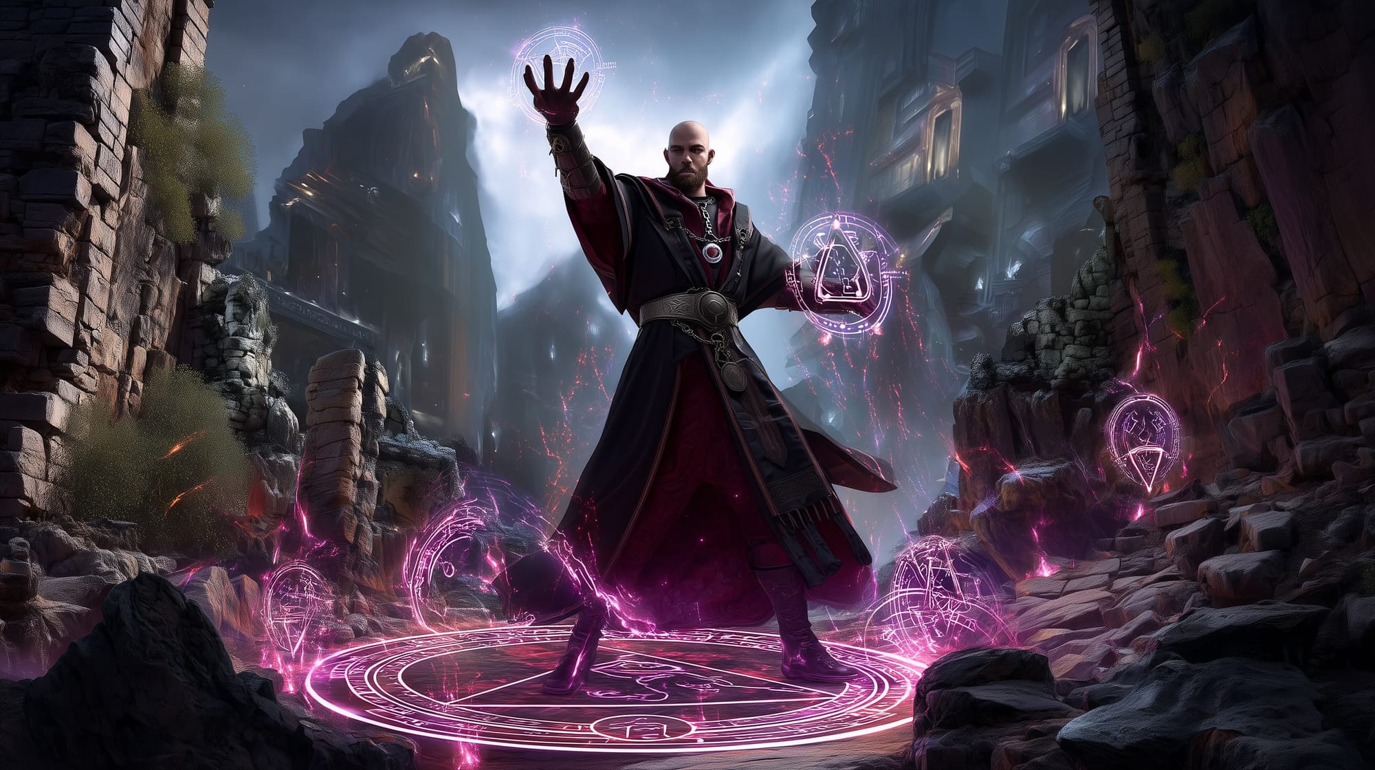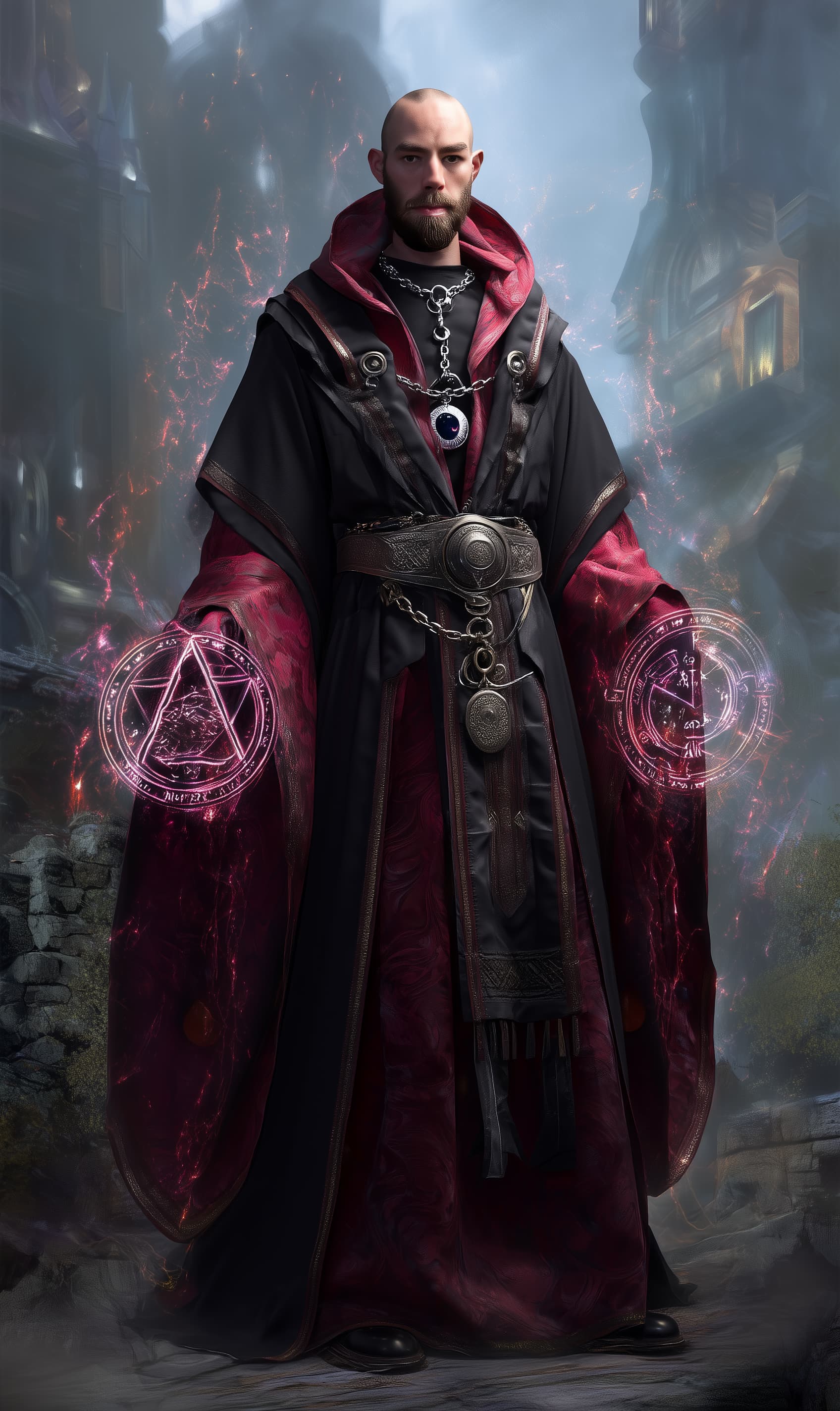 Appearance: Josar Khareth cuts a haunting figure draped in robes of shadow-black and deep wine-red, embroidered with subtle arcane sigils that flicker faintly when caught in peripheral vision. His pale skin contrasts against the dark folds of his attire, and a silver chain holds a black opal pendant—the focus of his eldritch power. He carries no obvious weapon, but the air around him distorts faintly, as if reality itself recoils from his presence.