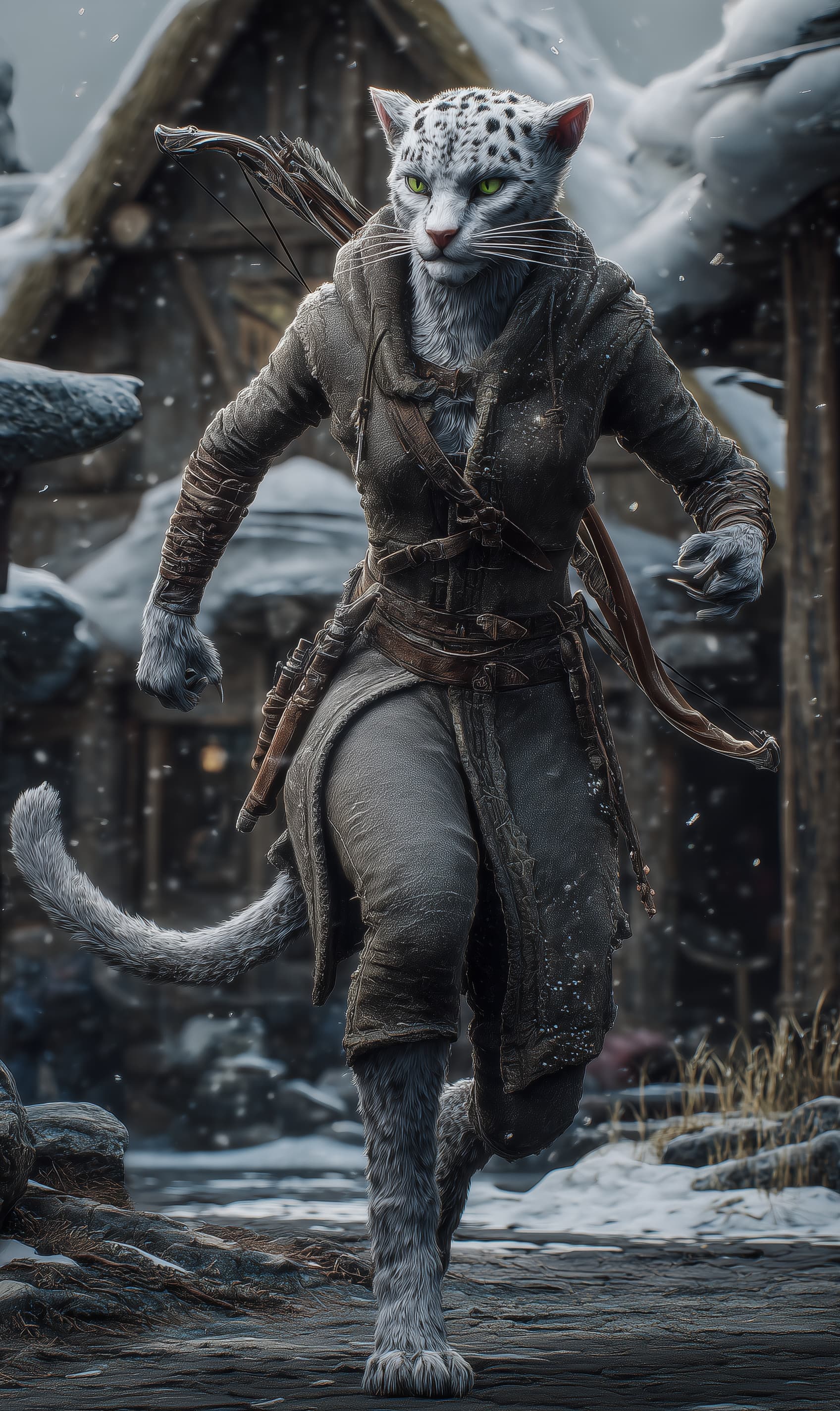 Appearance: Kethra is lean and long-limbed, her smoke-gray fur mottled with pale “frost rosettes” along her shoulders and tail. A white blaze marks her muzzle and forepaws. She wears a fitted, seal-lined courier parka over reinforced leathers. A short recurved bow rides a diagonal back-sling beside a bedroll; a curved saber hangs low for ease of movement. Her belt carries waxed message tubes, a signal whistle, and spare tug lines. When she moves, it’s with coiled economy—a runner measuring every step against the storm.